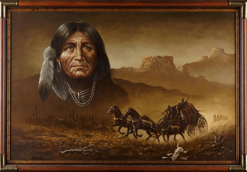 Large framed painting on canvas of stagecoach being chased by Indians with large portrait of warrior’s face superposed on scene; artist’s signature appears to be Jhon Stanford, approximately 28” x 39” overall. Est.:$150-$300.
