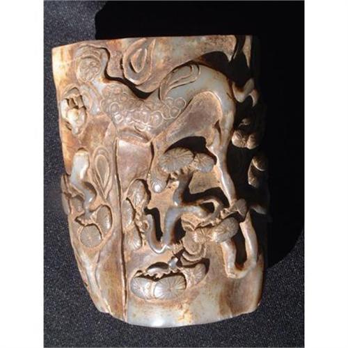 Ming period green jade brush container in shape of a bamboo section decorated in high relief with a pine tree. Size: 5.5" X 4.2" (14 X 11 cm.). Estimated value: $10.000.