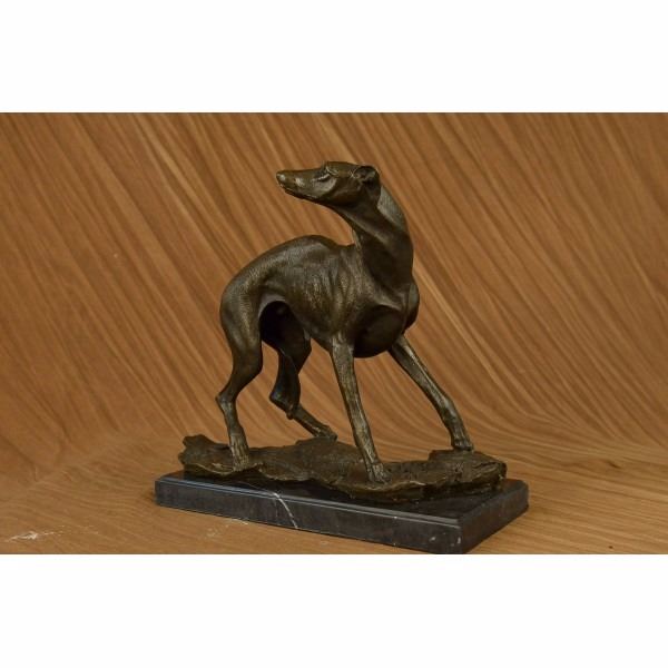 This is a bronze sculpture of an Italian greyhound which is the smallest of the sight-hounds. The docile nature of the dog is seen through its body language as the dog cowers, pulling its tail between its legs, looking up with a concerned and pleading look to its eyes. The artist captured the true essence and likeness of the breed with its elegance and grace. The handmade bronze sculpture was captured using the ancient method of lost-wax casting and stained with a brown patina finish for preservation. It is mounted upon a black marble base. Bronze dimensions with marble base: Height 13 X Width 13 inches. Weight: 20 lbs.