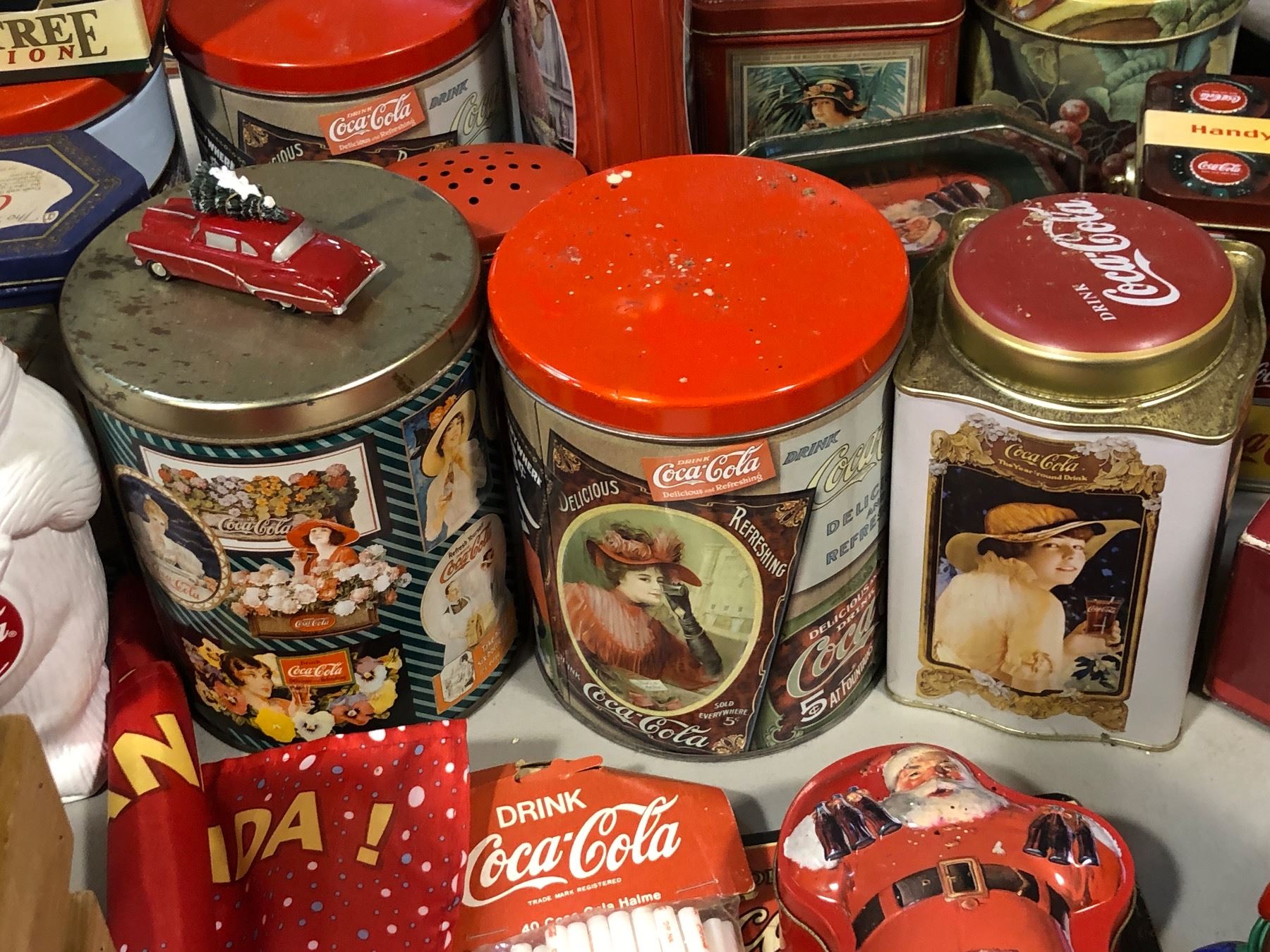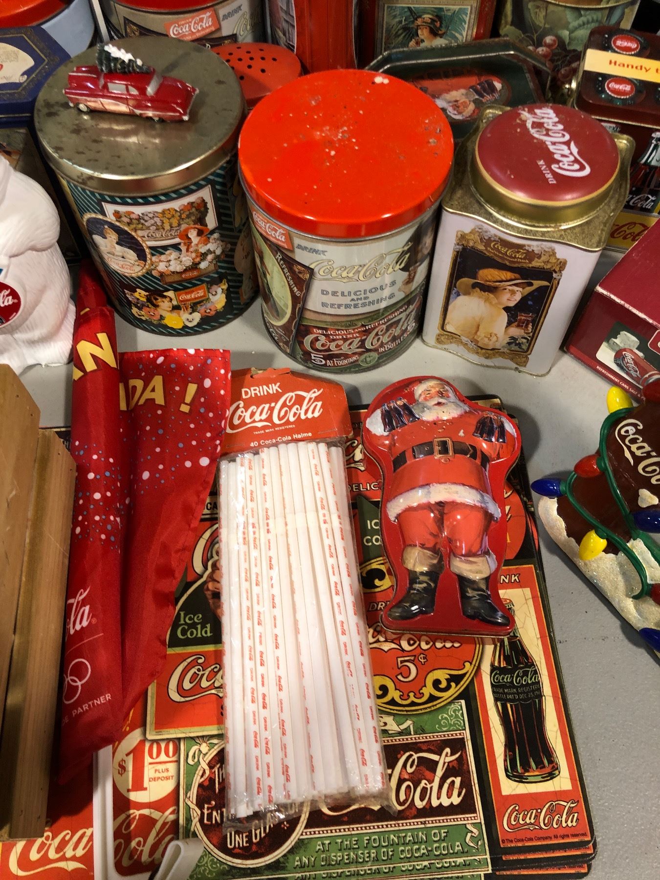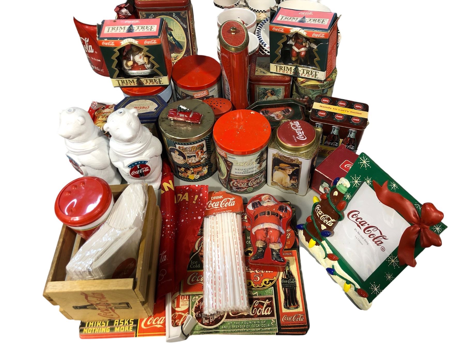 Large group of Coca Cola items - picture frame/ tins/ ornaments/ place mats & more