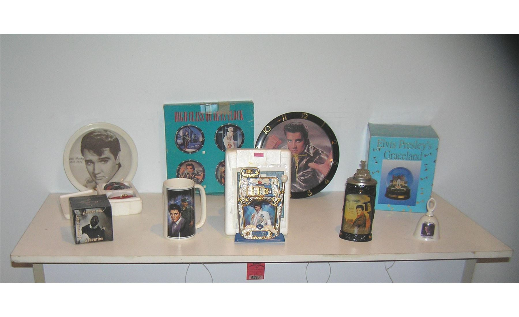 Elvis Presley collectibles this large group includes a beer stein, mug, slot machine plaque, clocks, snow globe, bell, plate and more est. value $125.00-$150.00