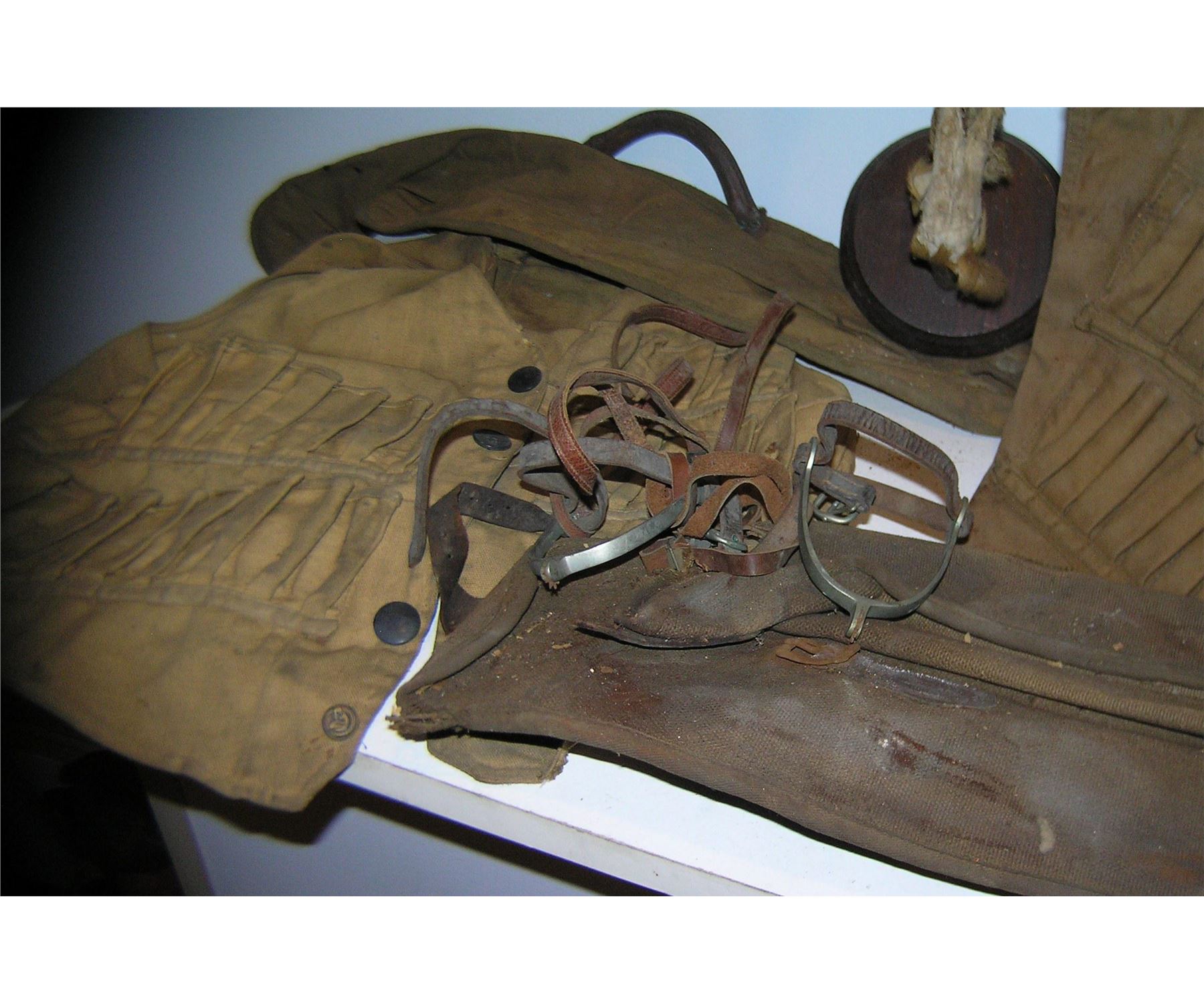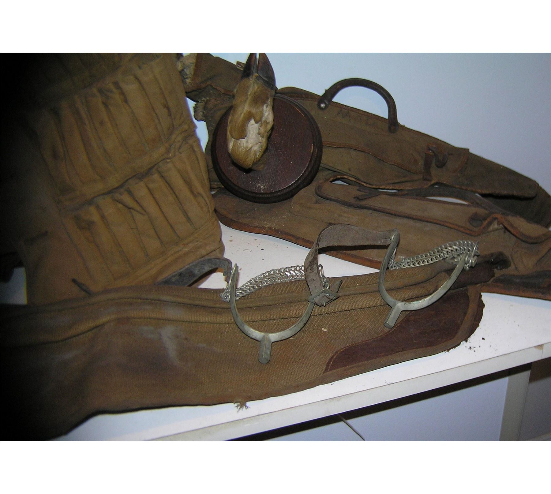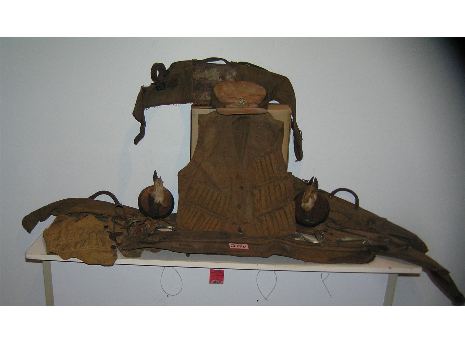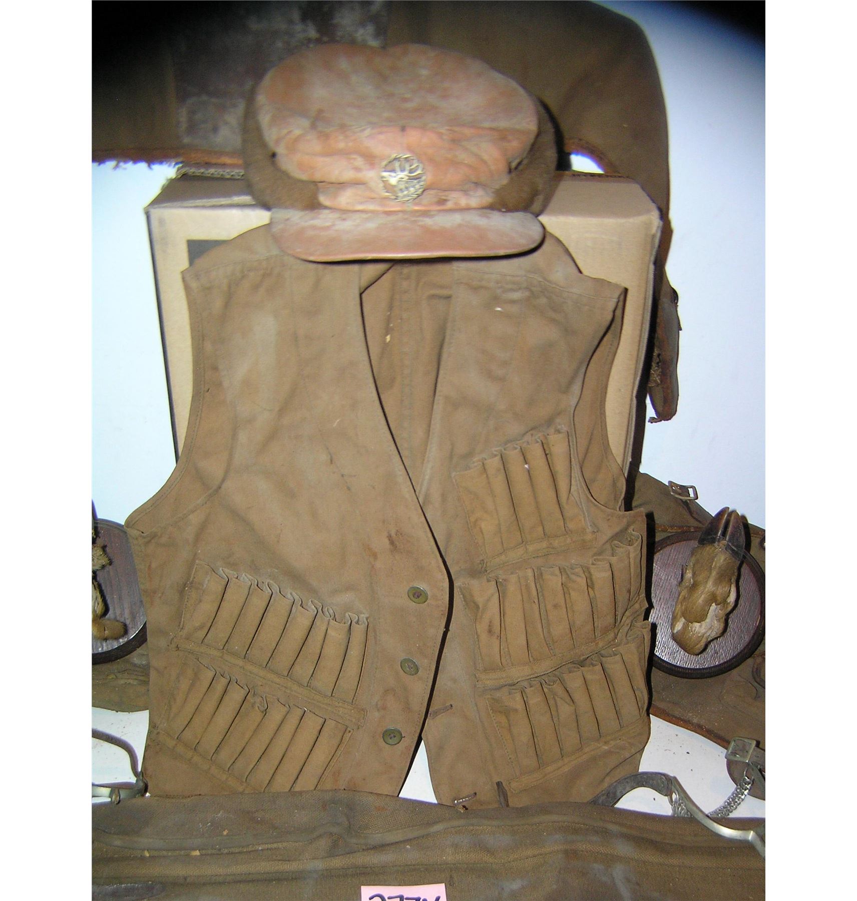 Large group of antique leather and canvas hunting gear includes a pair of early vests, hunter hat with figural buck pin, various gun case, pair of deer hoof wall mounts and 2 pairs of great early stirrups all condition as found estate attic find in old trunk est. value $ 175.00-$200.00