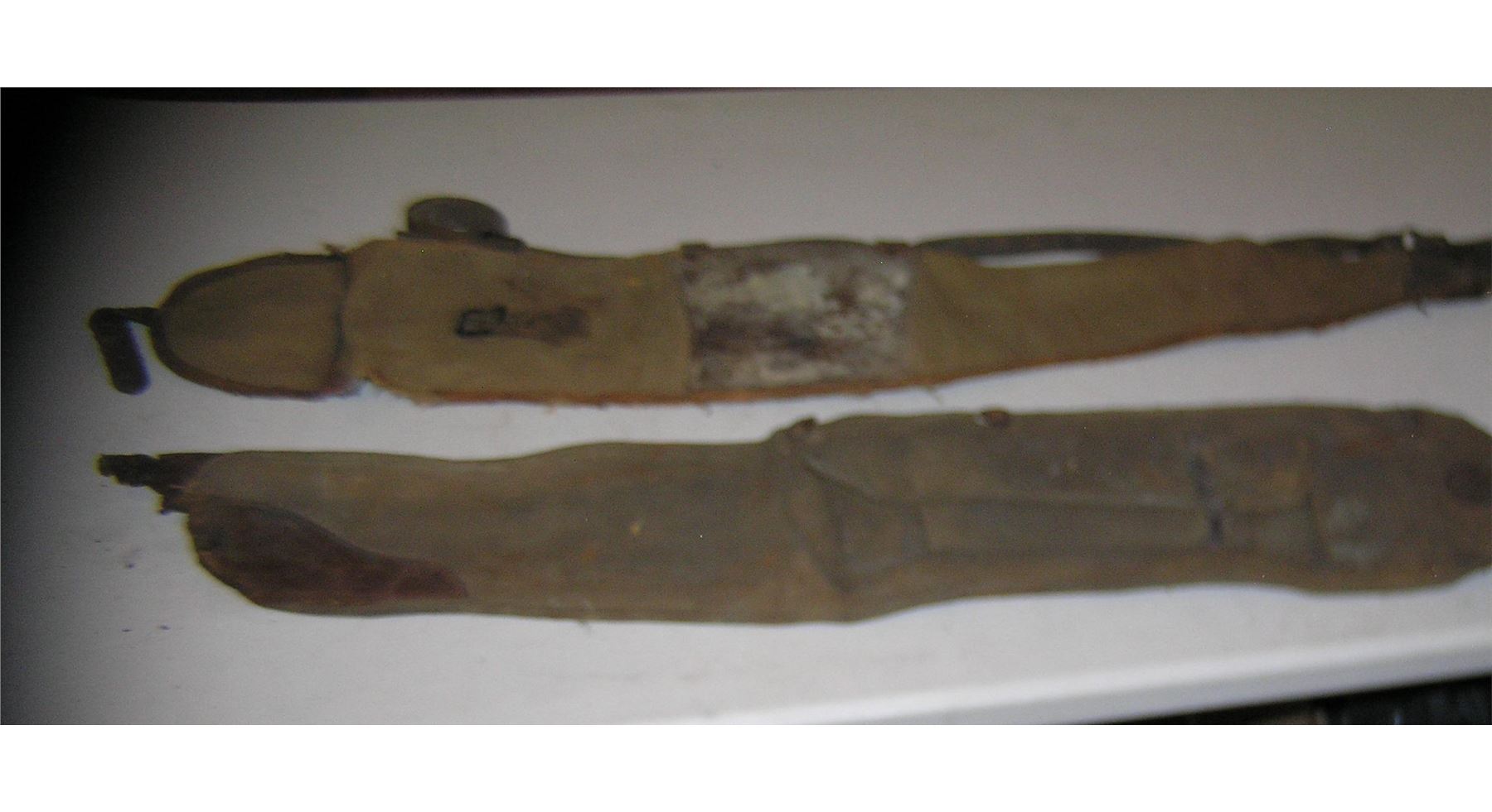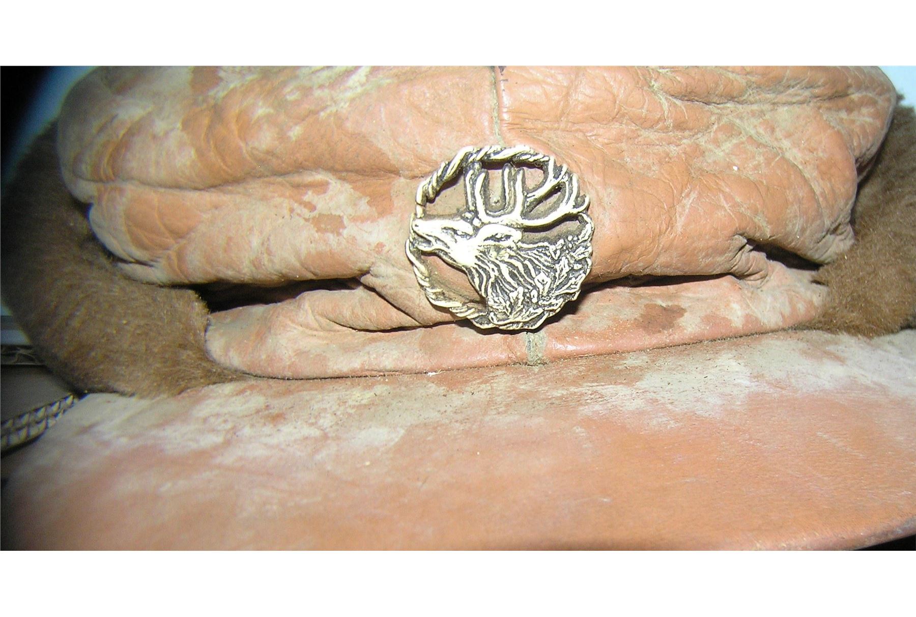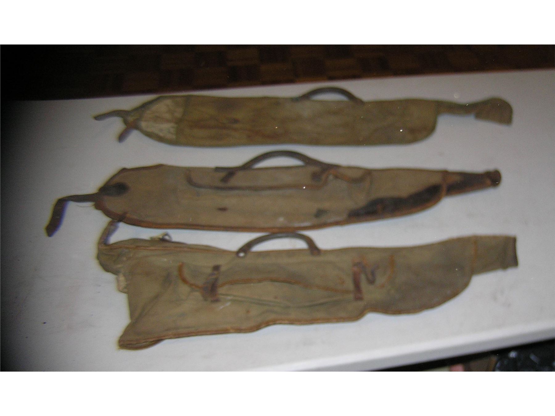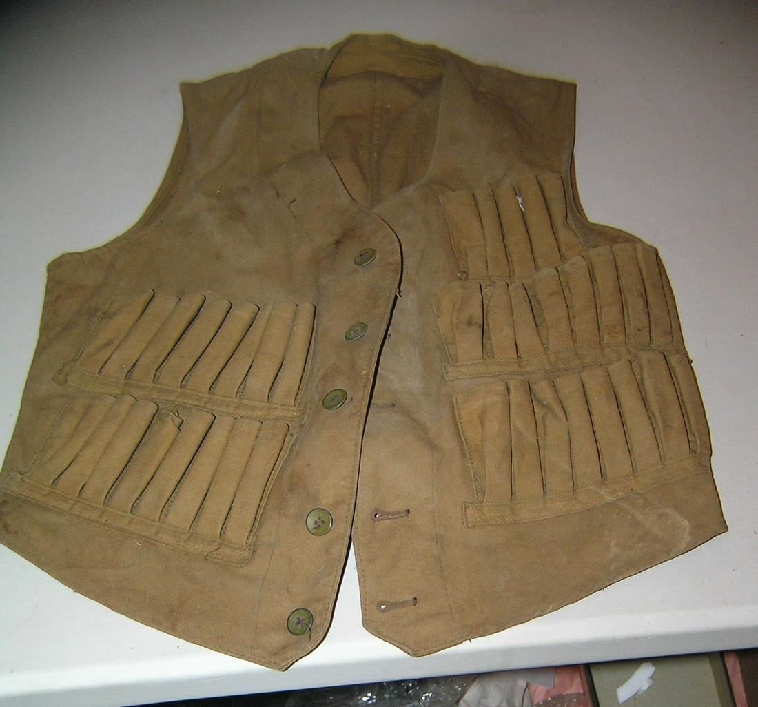Large group of antique leather and canvas hunting gear includes a pair of early vests, hunter hat with figural buck pin, various gun case, pair of deer hoof wall mounts and 2 pairs of great early stirrups all condition as found estate attic find in old trunk est. value $ 175.00-$200.00