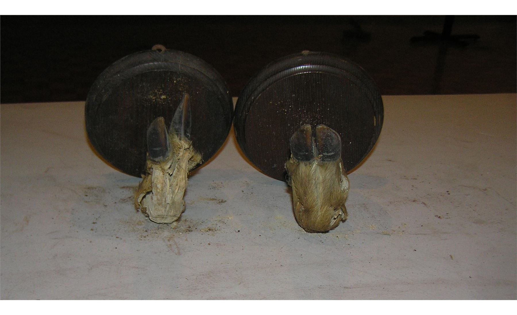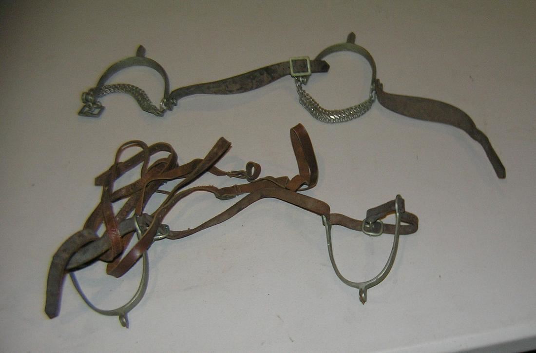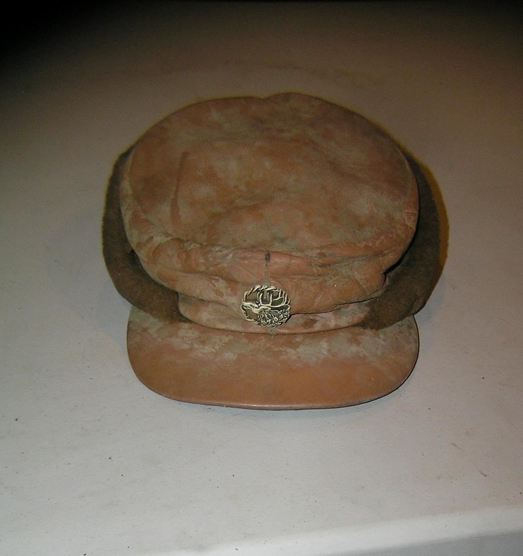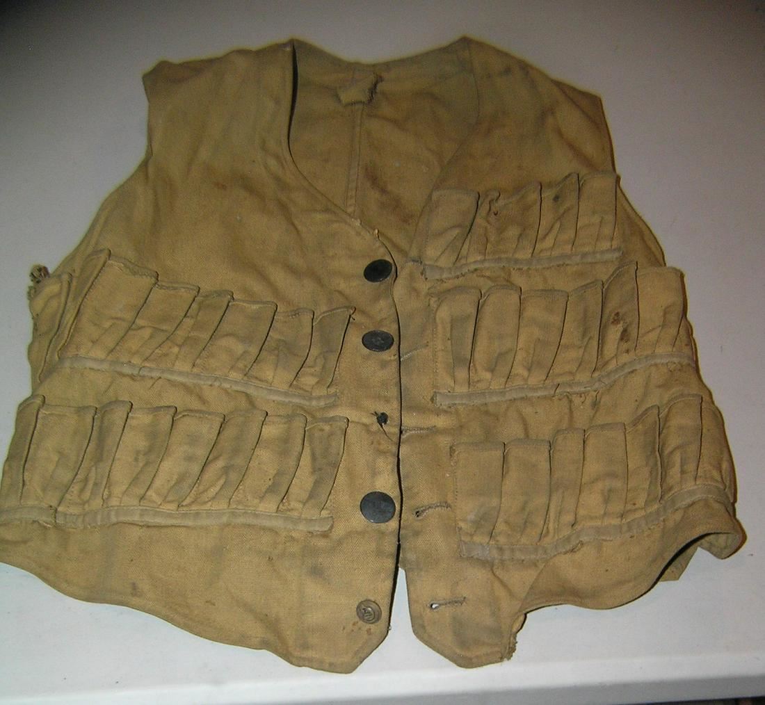 Large group of antique leather and canvas hunting gear includes a pair of early vests, hunter hat with figural buck pin, various gun case, pair of deer hoof wall mounts and 2 pairs of great early stirrups all condition as found estate attic find in old trunk est. value $ 175.00-$200.00