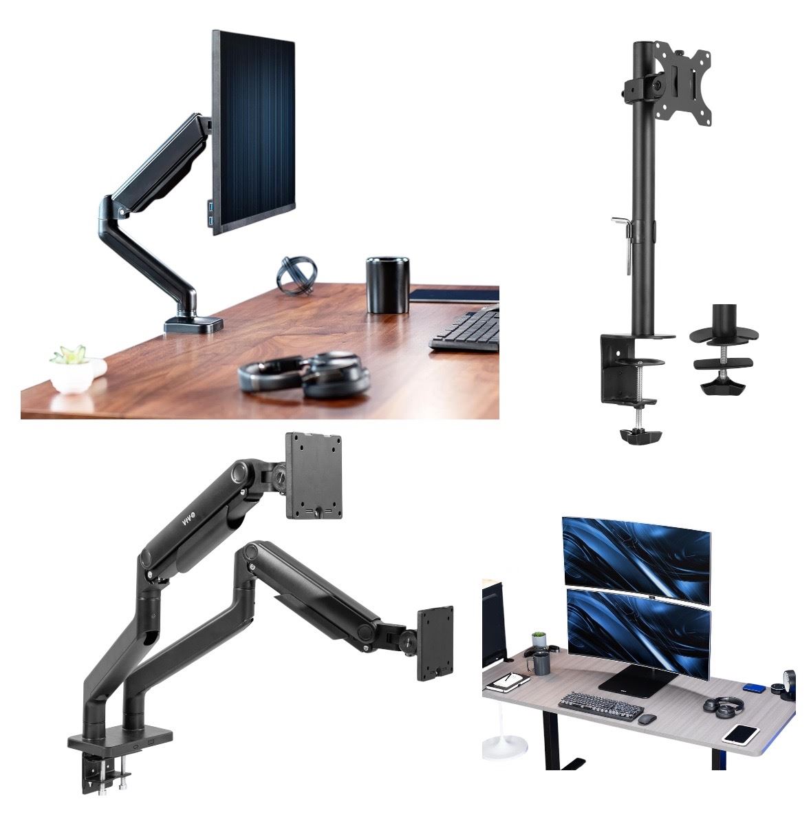 Large group of assorted VIVO monitor desk mounts - single, mechanical arm, dual monitor, desk stands etc, (approx. 12pcs)