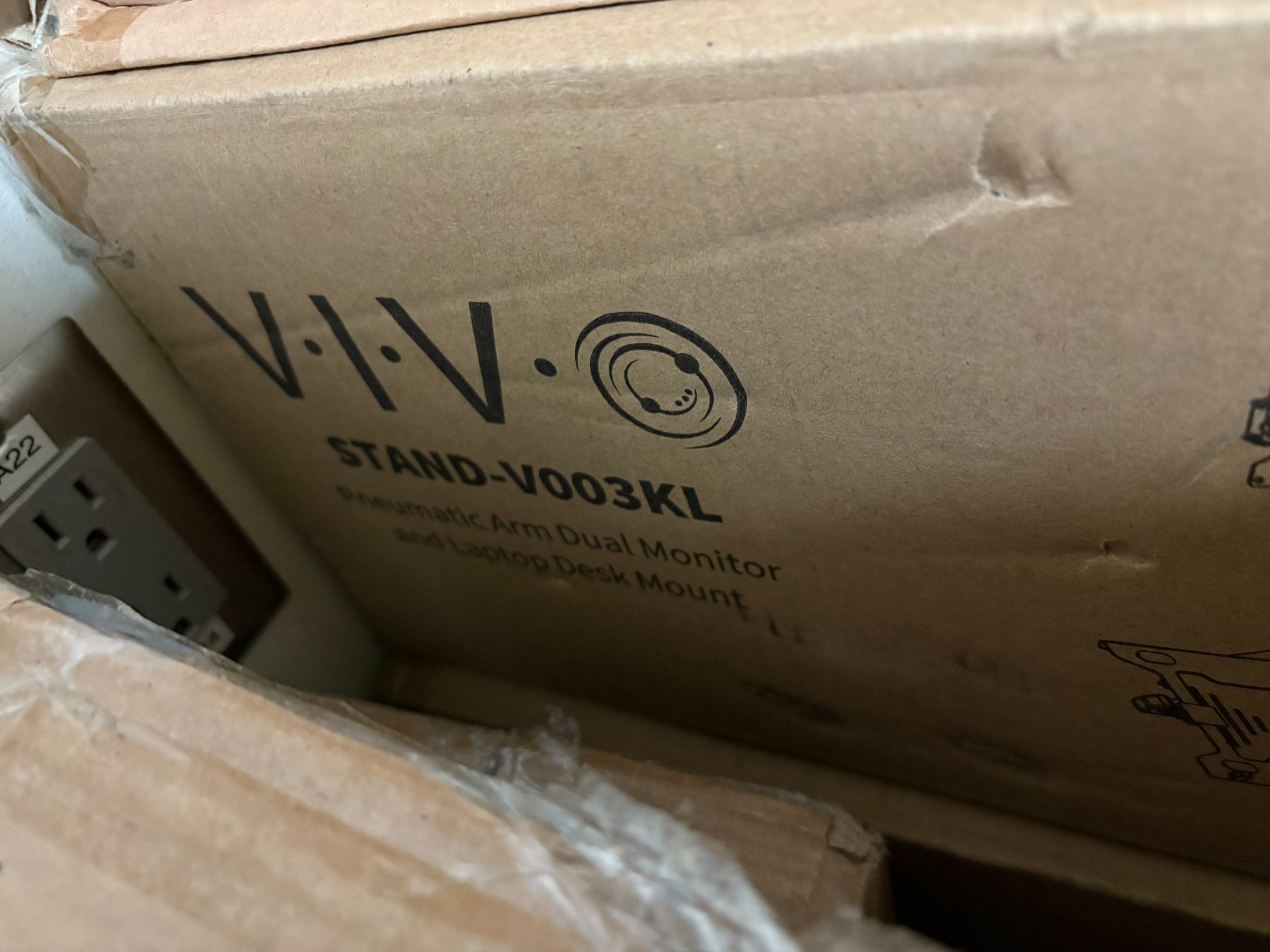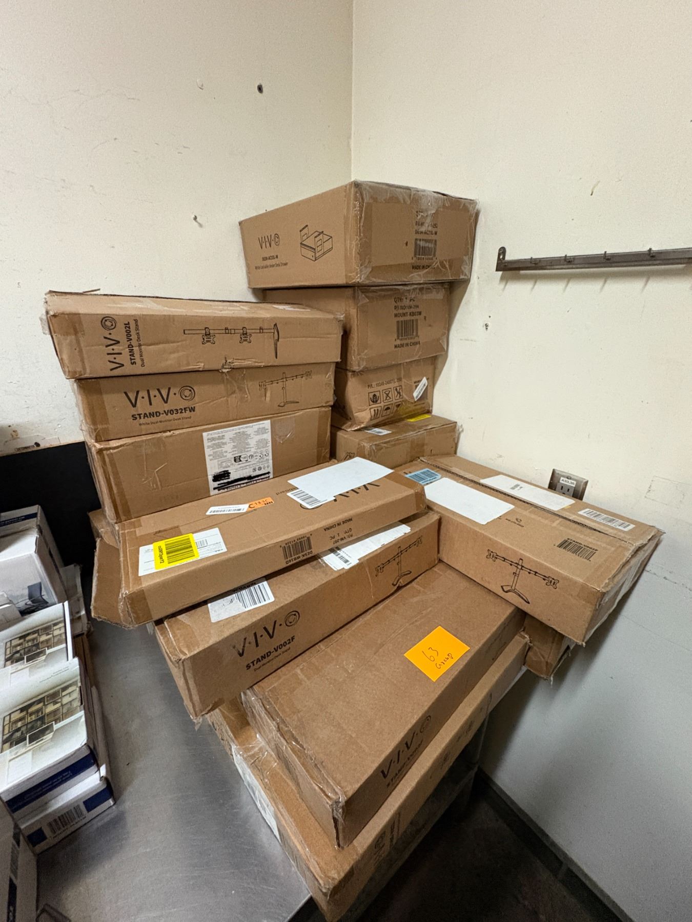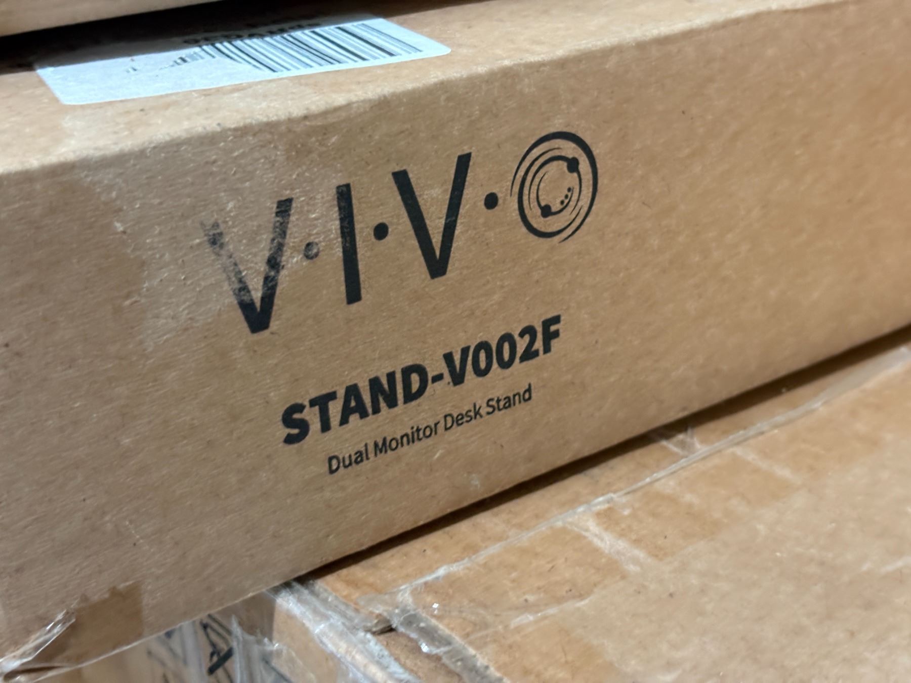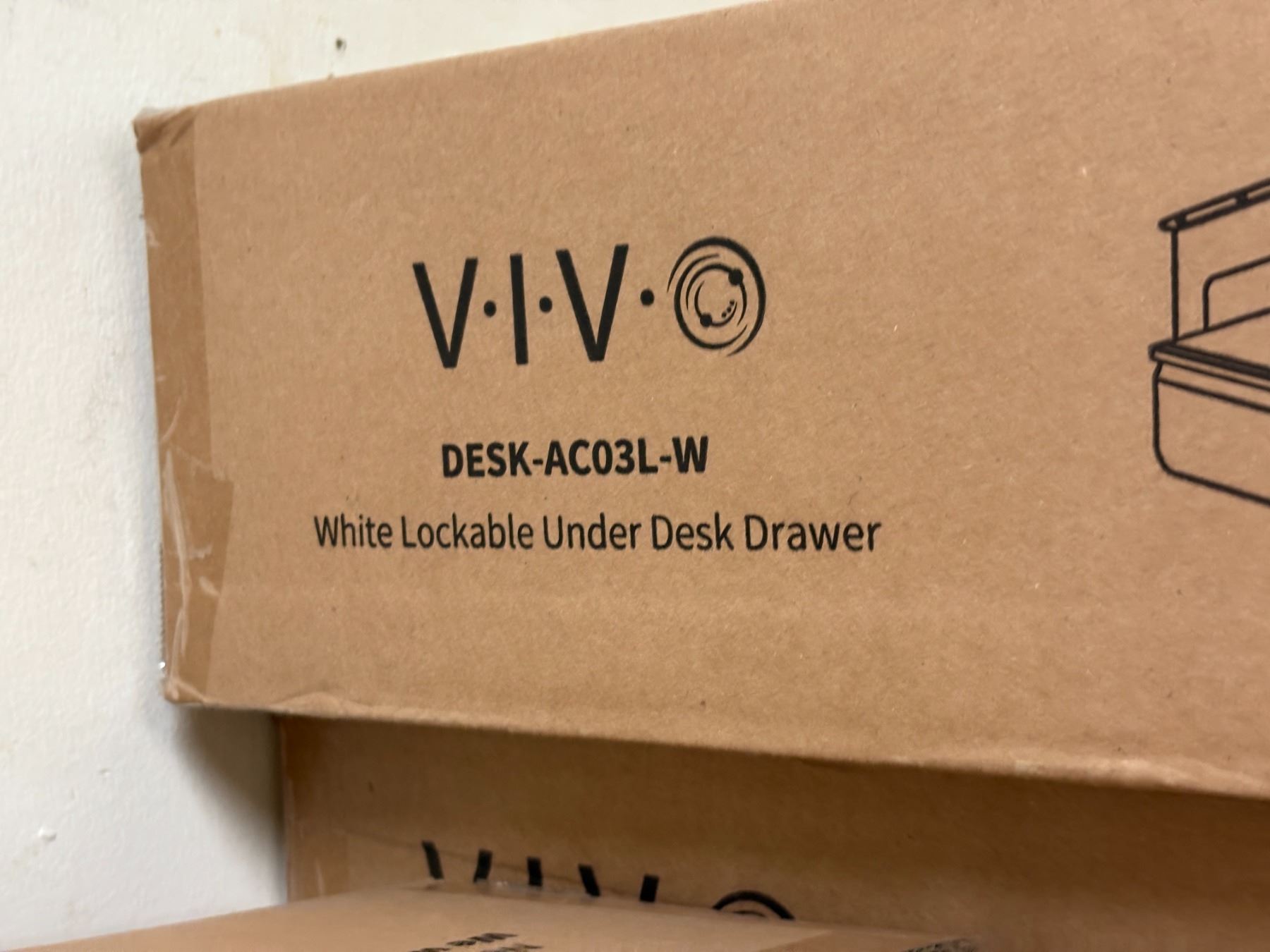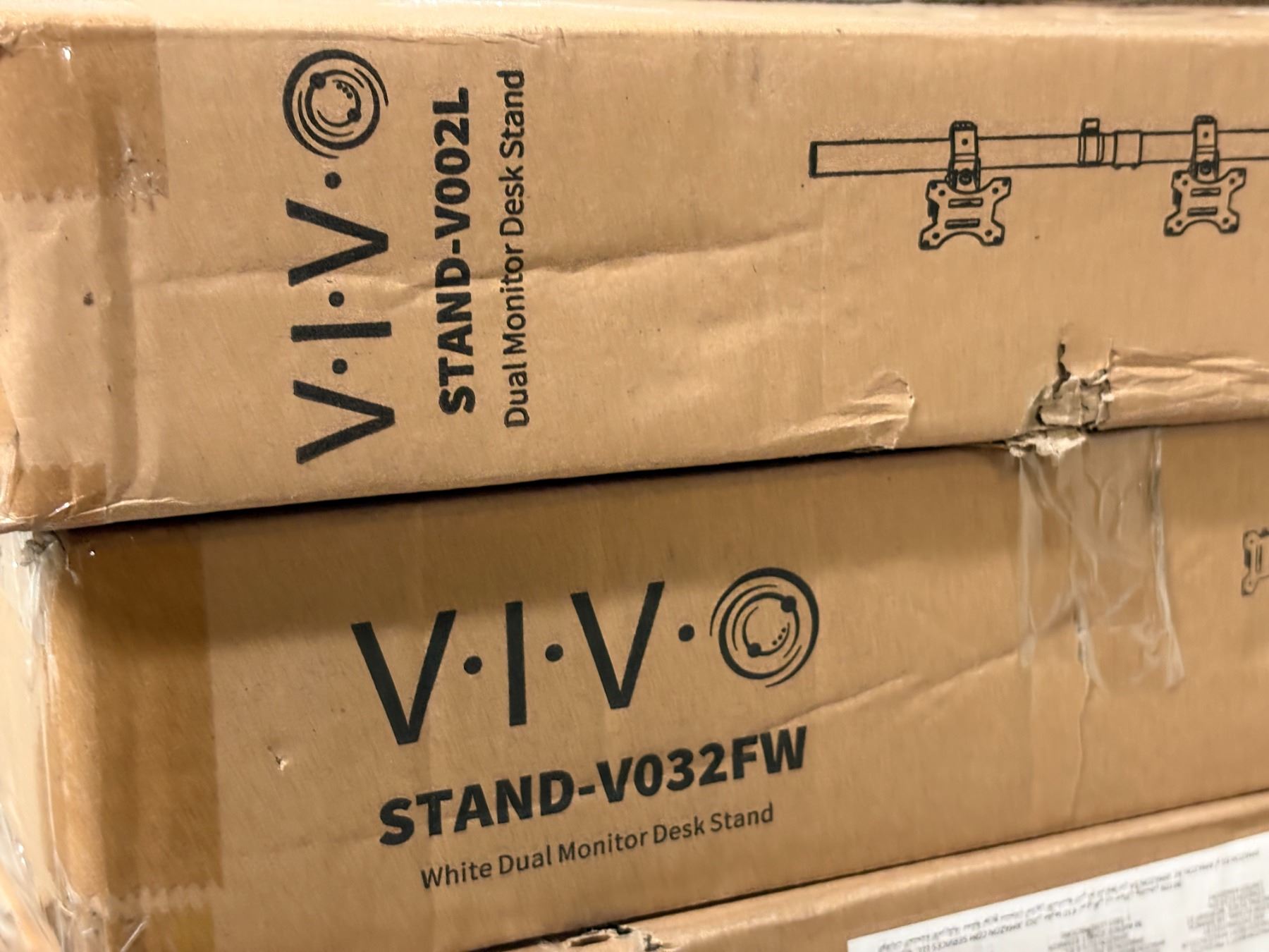 Large group of assorted VIVO monitor mounts & accessories - white dual monitor desk stand, white lockable drawer, dual monitor, laptop holder mount (approx. 20pc) (refurbished in boxes)