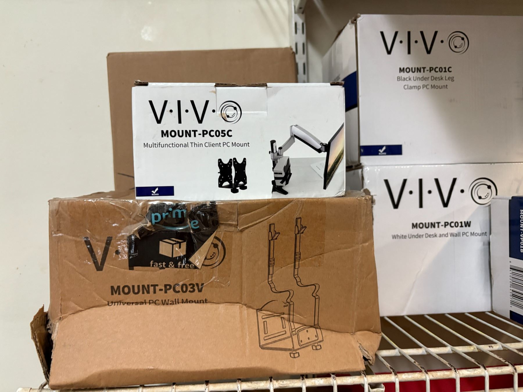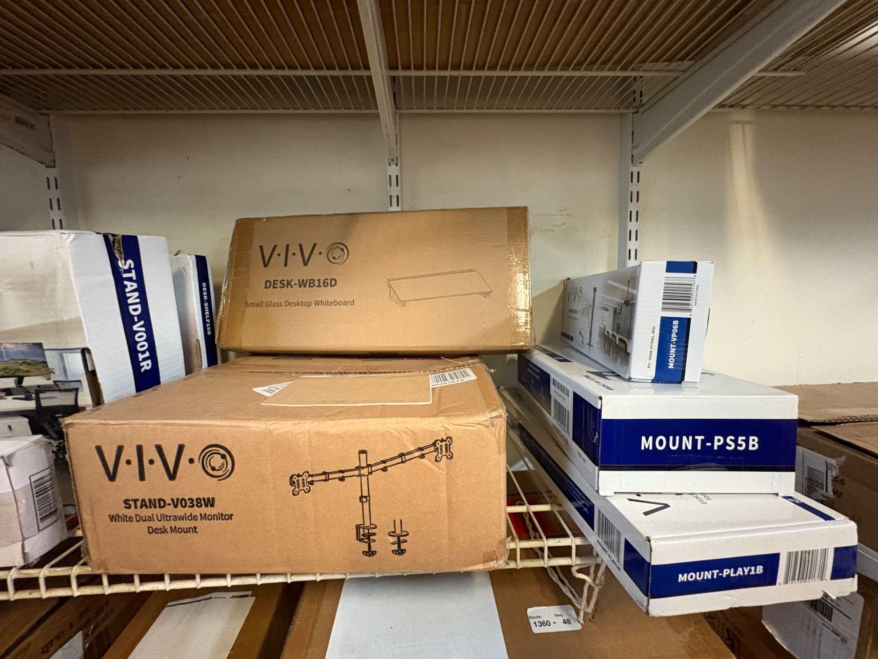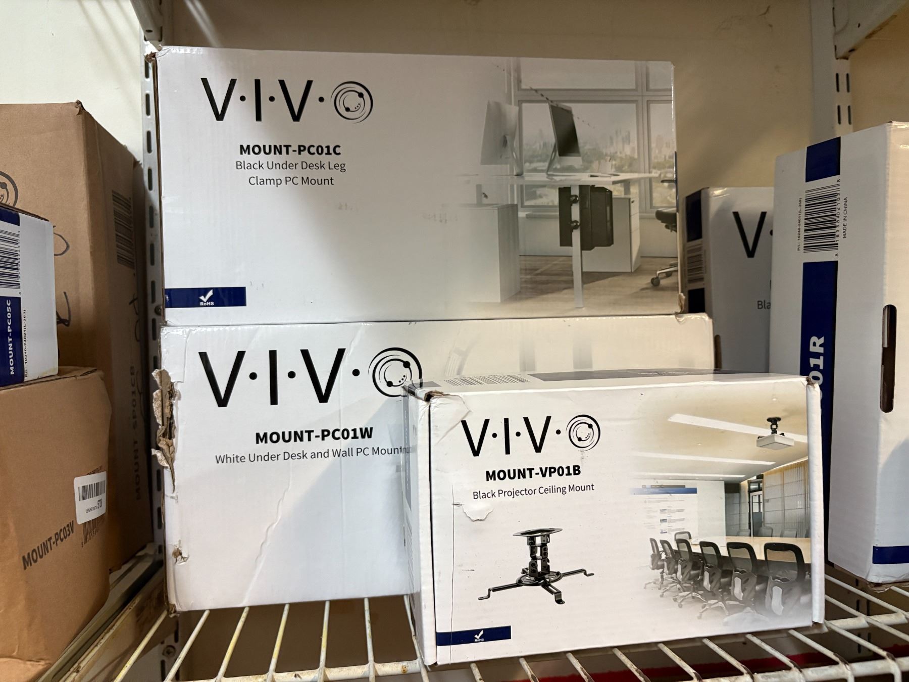 Large group of assorted VIVO mounts & accessories - black projector ceiling mount, ultrawide dual monitor etc. (approx. 15pcs) (refurbished in boxes)