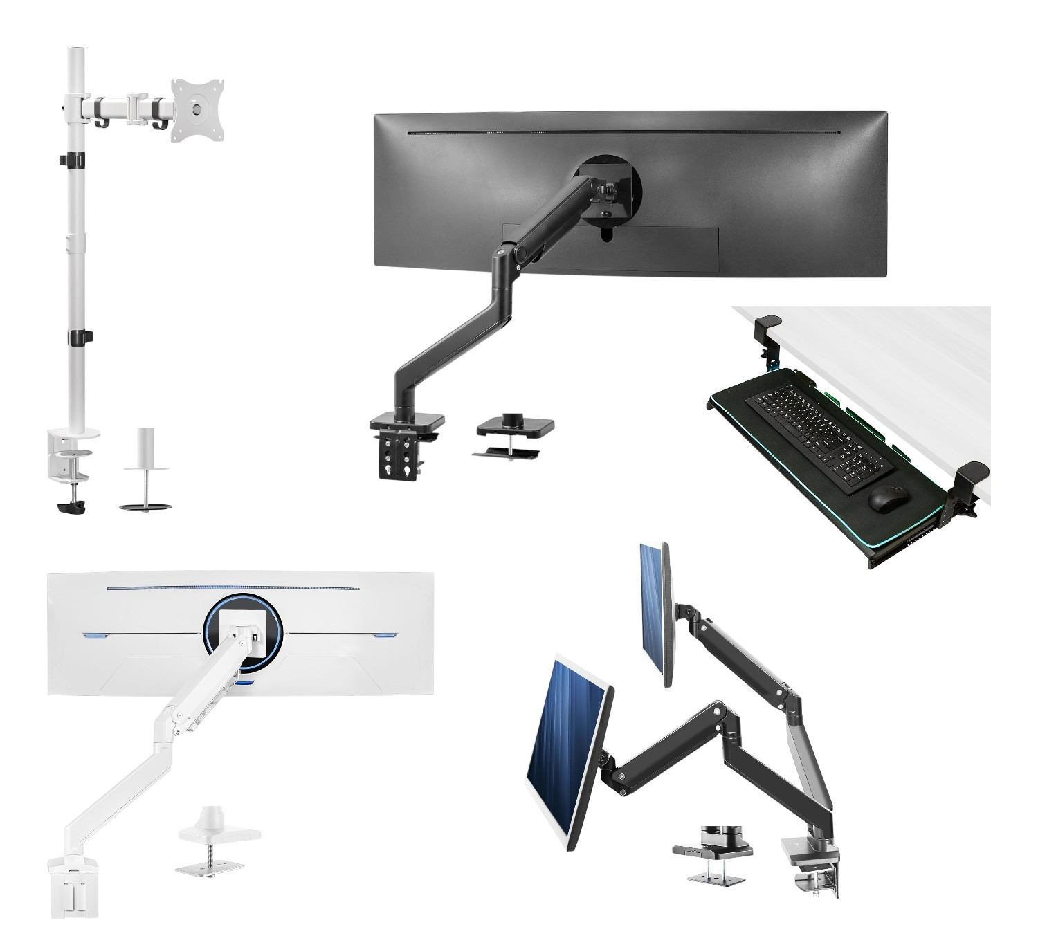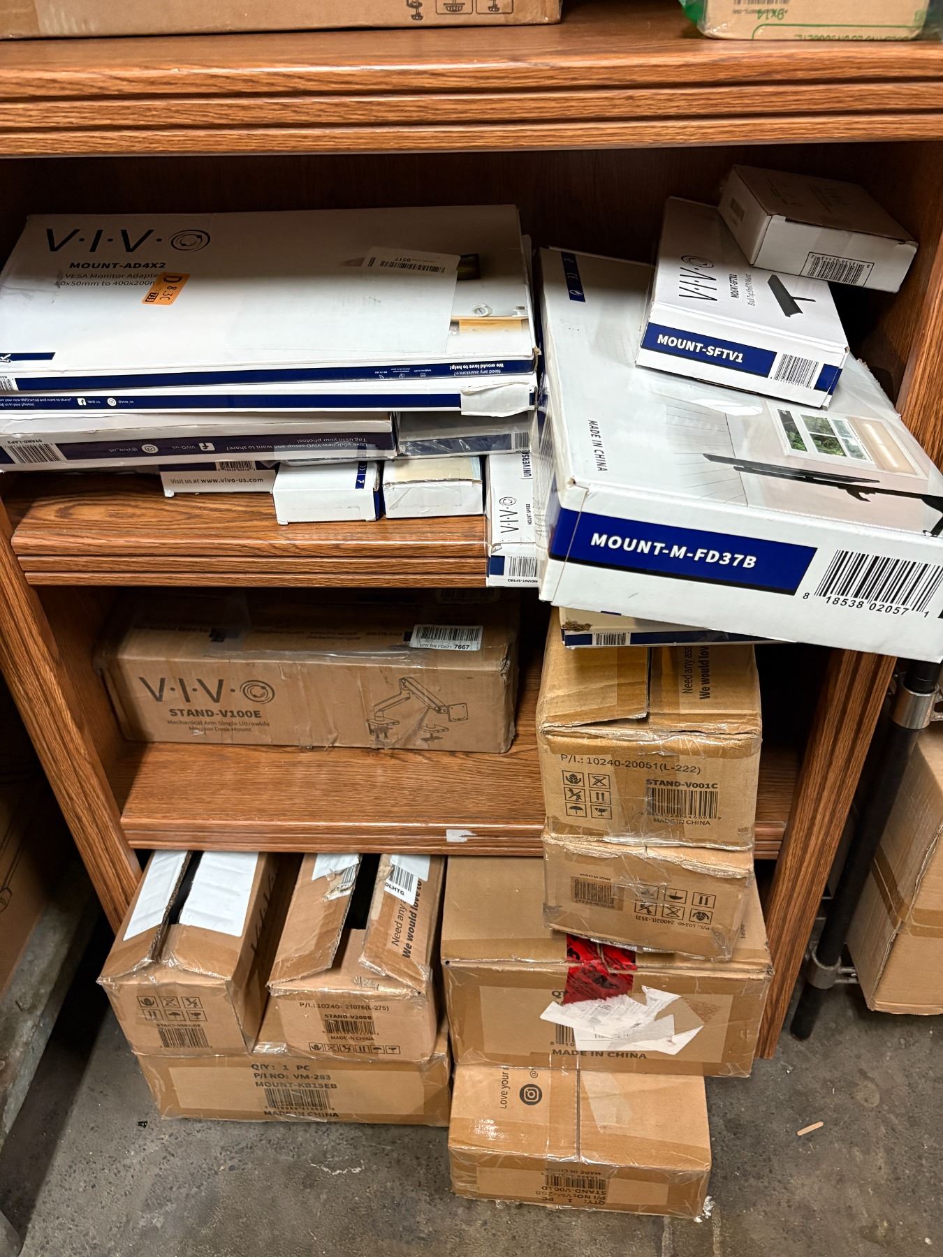 Large group of assorted VIVO mounts - single, dual, extra tall mounts, VESA monitor mounts, mechanical arm, ultra wide etc. (refurbished in boxes)