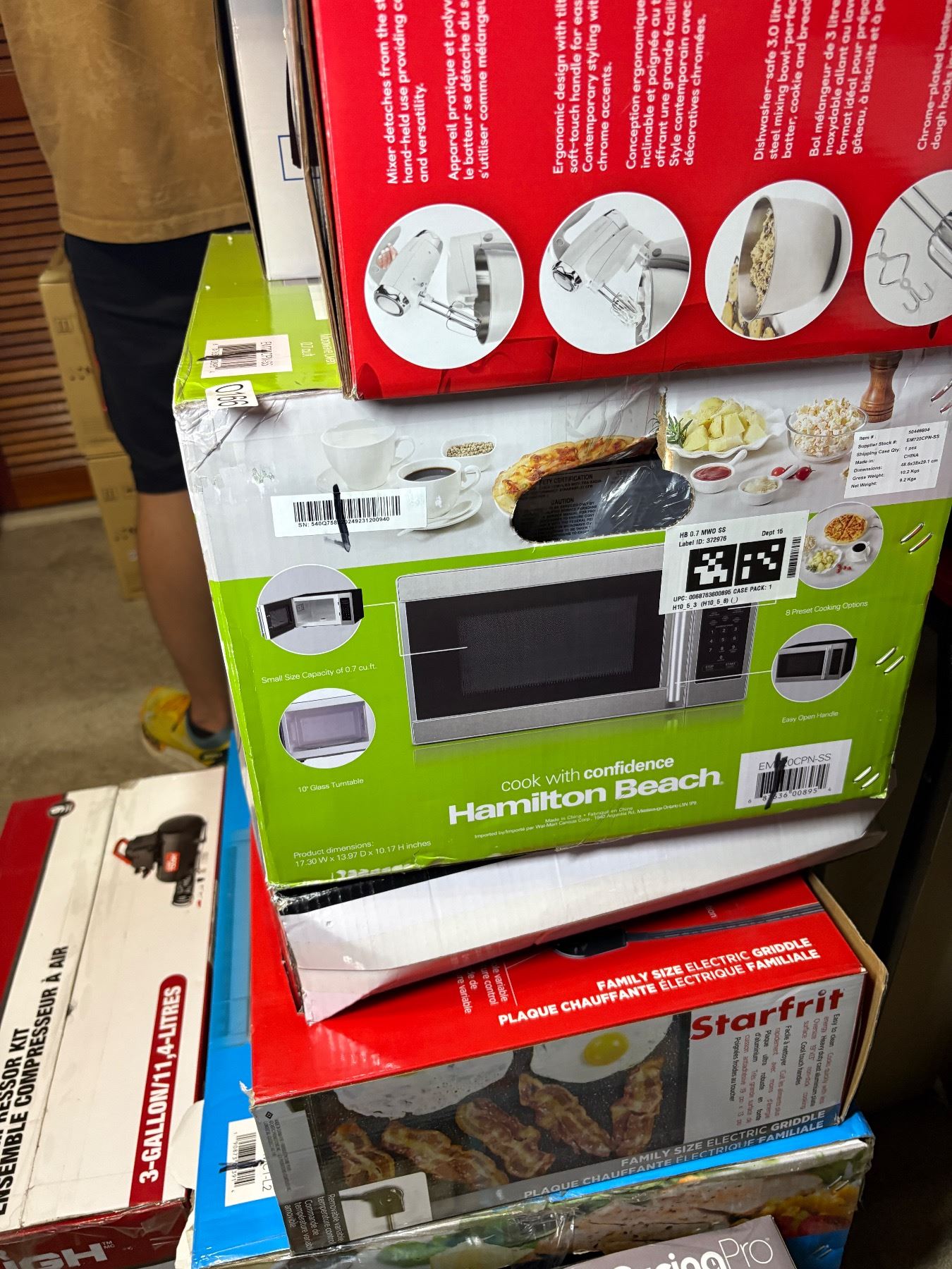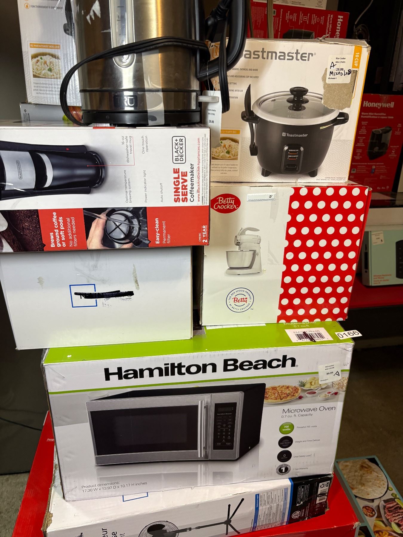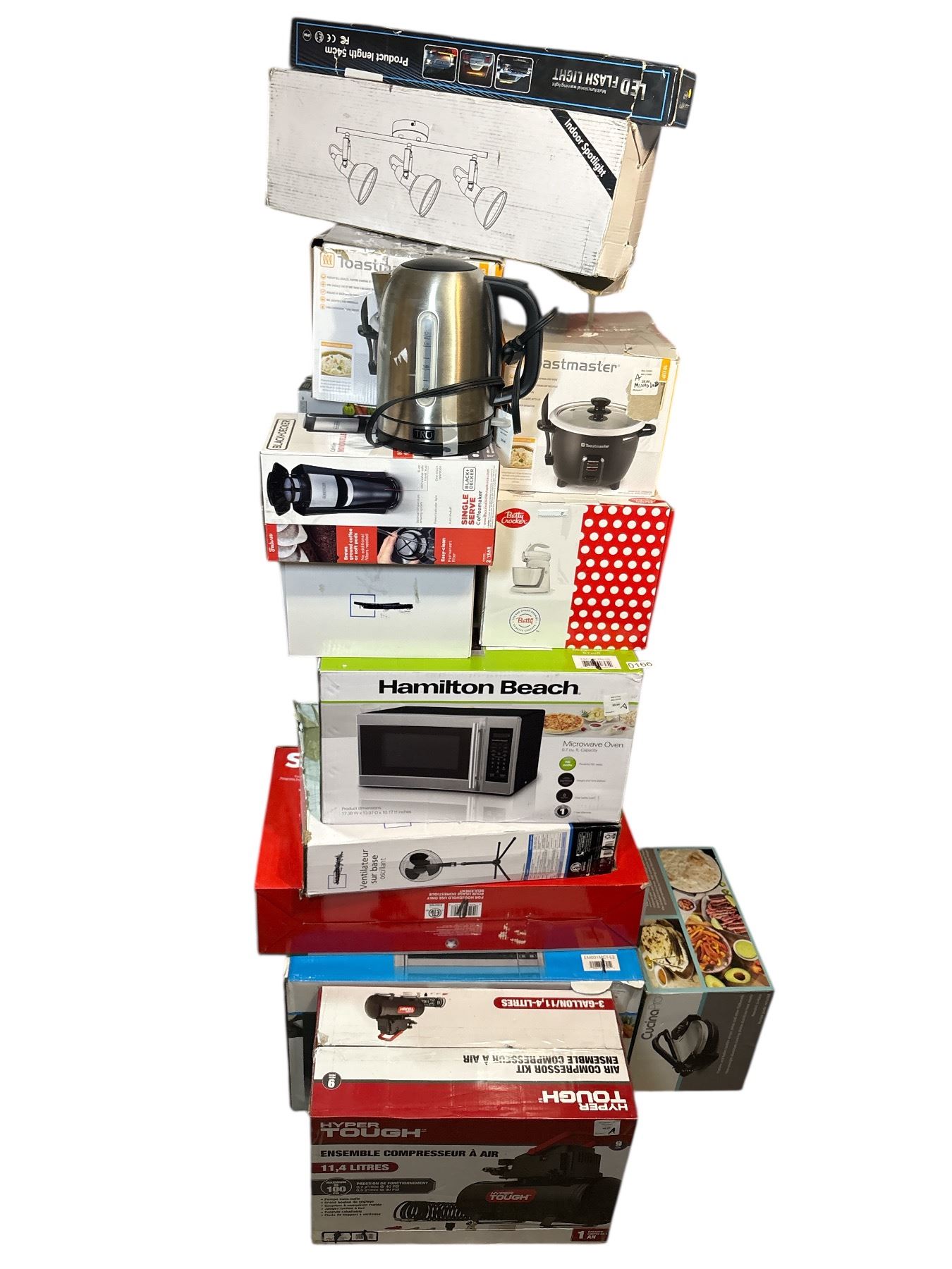 Large group of assorted electronics - Microwave oven, tortilla maker, coffee maker, lights etc. (MIX OF WORKING, NON-WORKING, NOT TESTED AS IS MERCHANDISE)