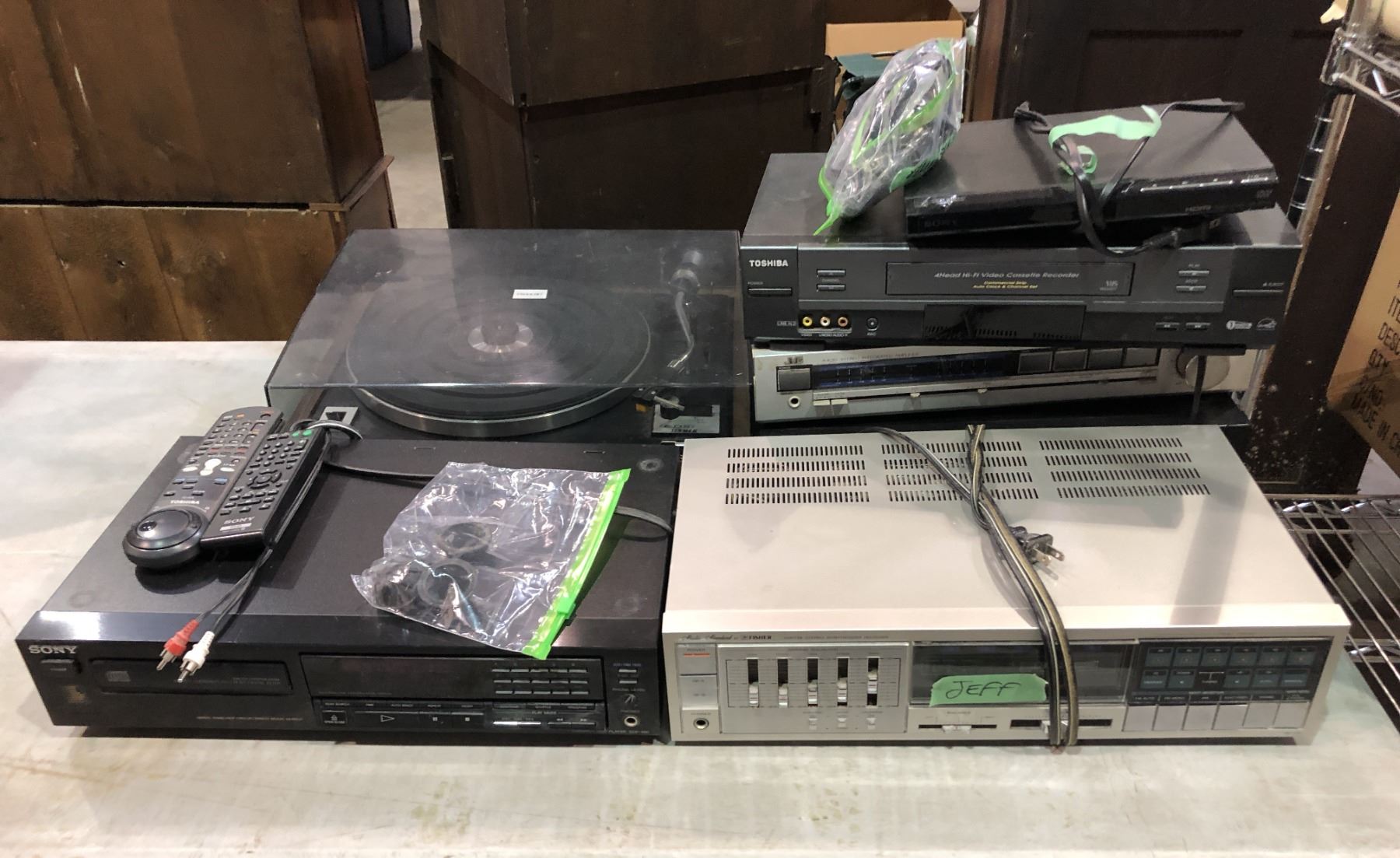 Large group of assorted electronics - includes video cassette recorder / record player & box of asso