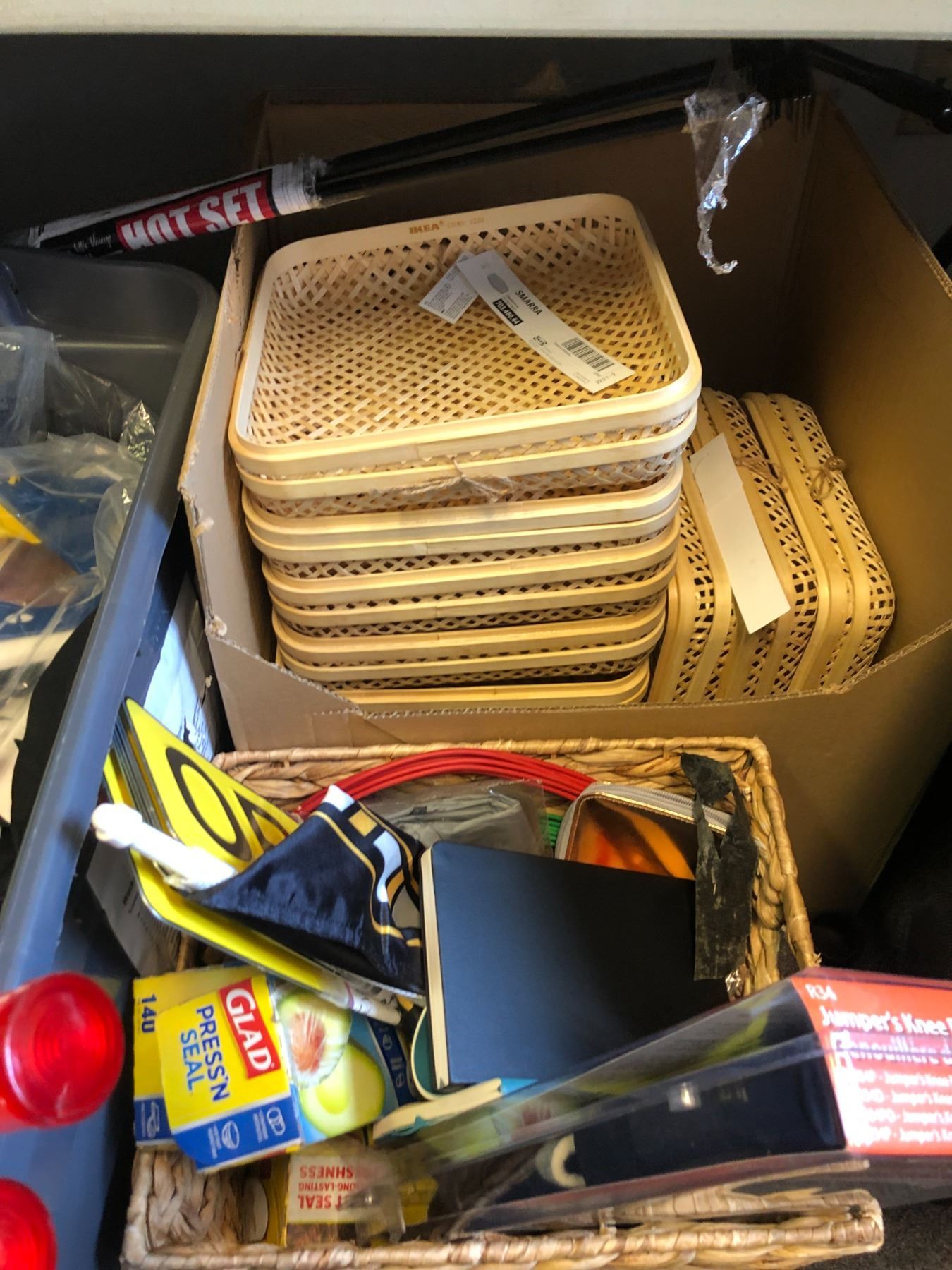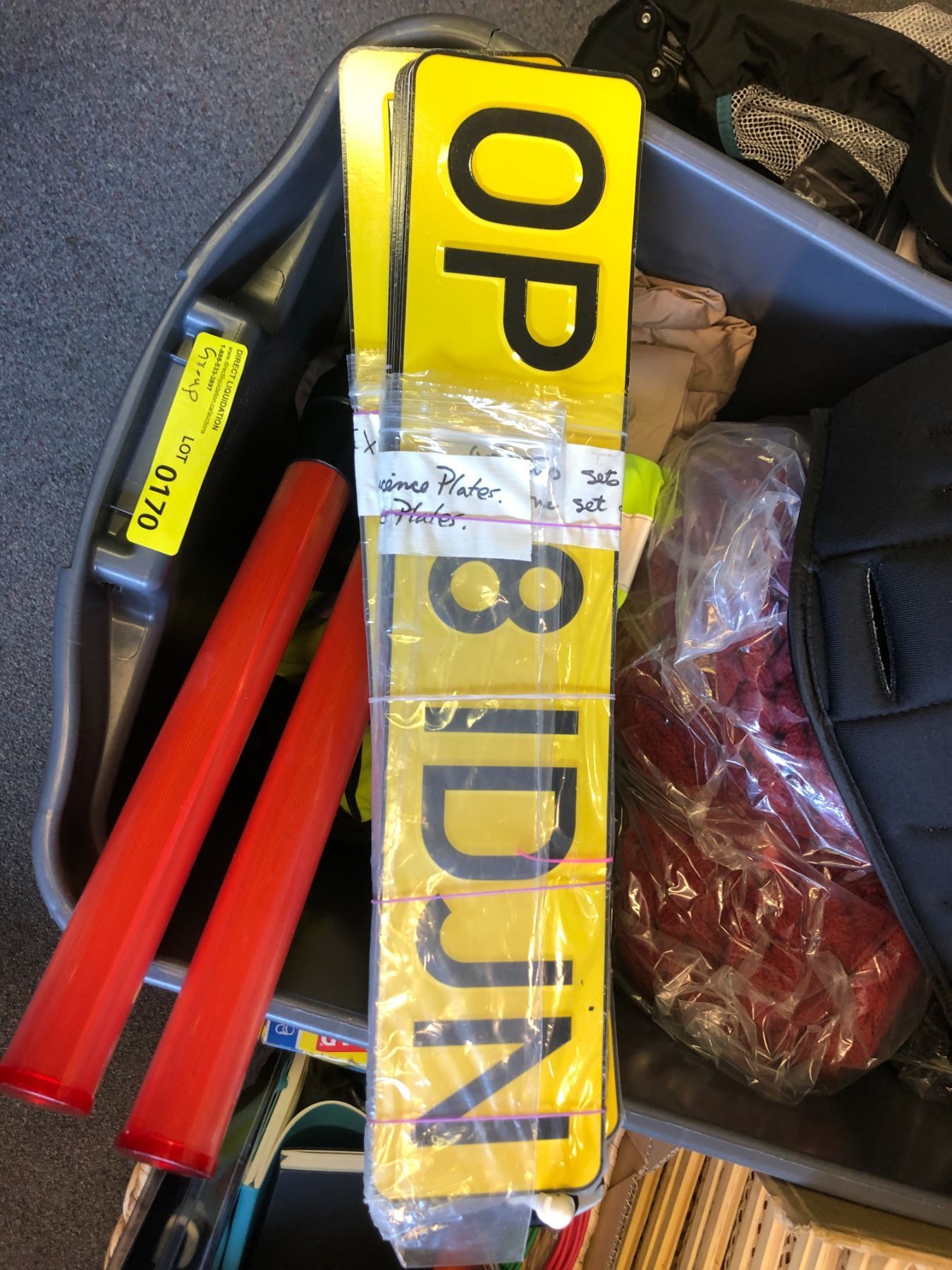 Large group of misc. set dec items - includes car number plates/ wicker basket/ kids folding bed etc.