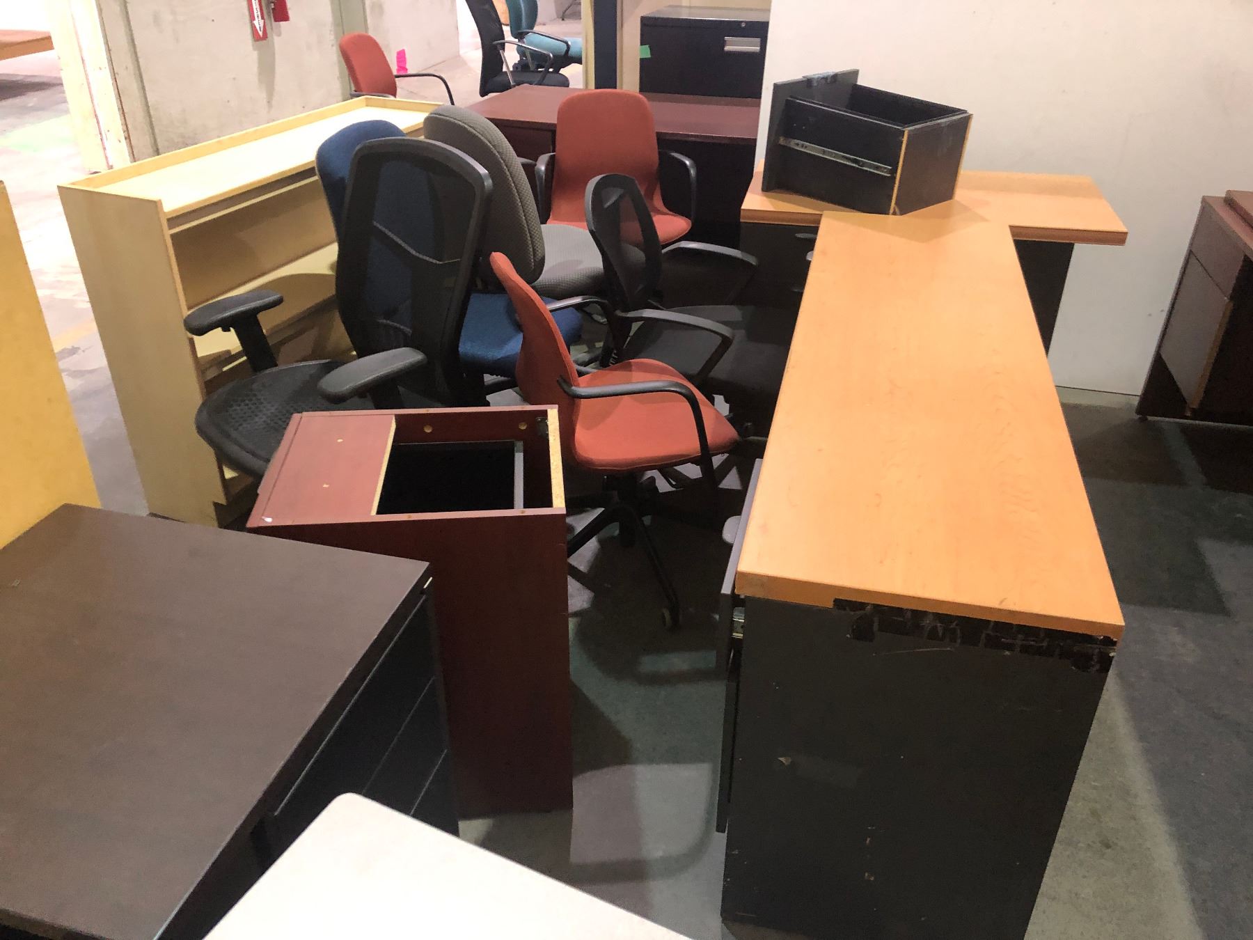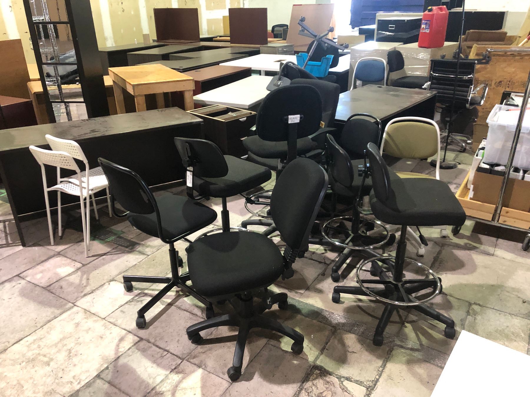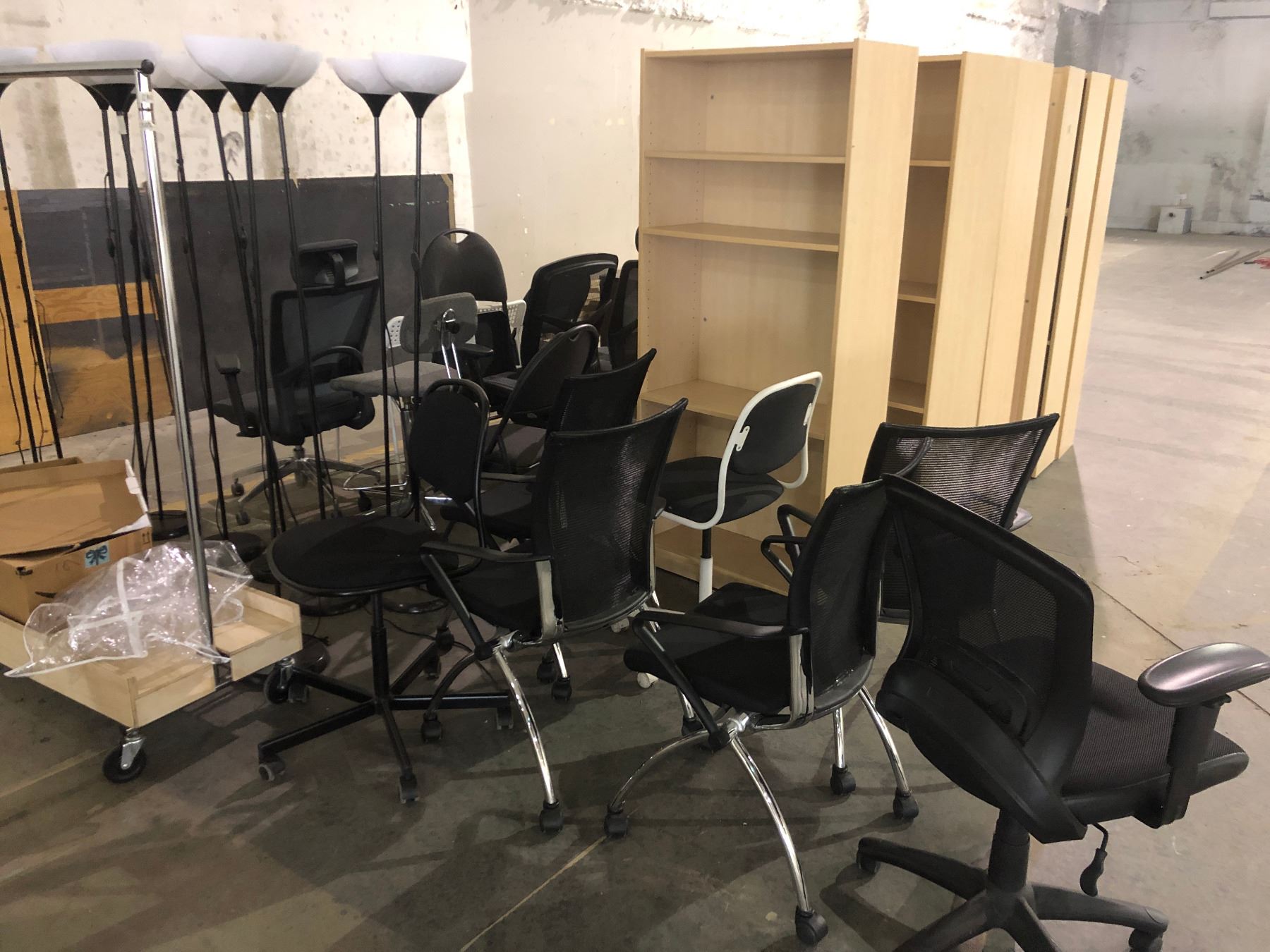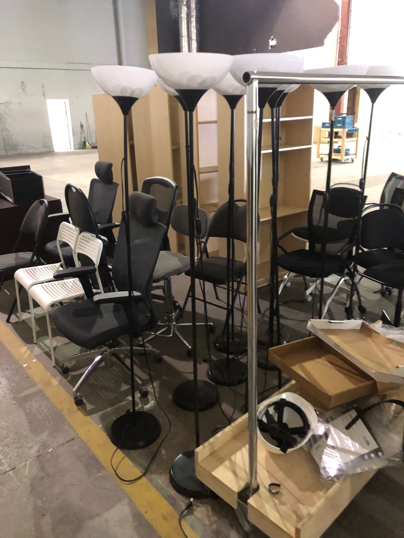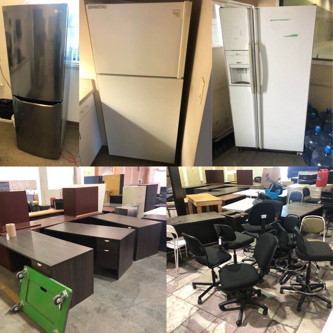 Large group of office furniture & 5 good working refrigerators (MUST TAKE ALL) - includes office chairs/ office desks/ office shelves/ floor lamps/ 2 rolling racks/ step ladders/ good working refrigerators etc.