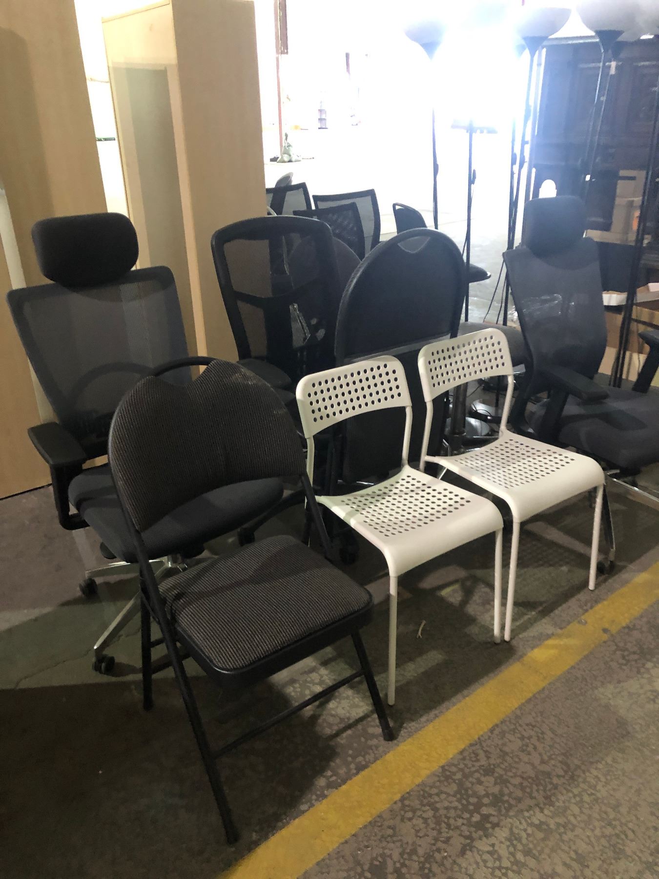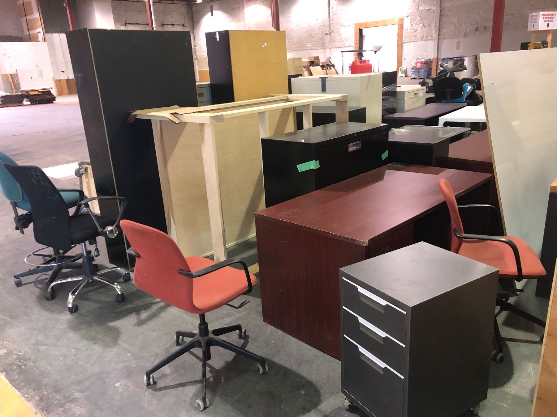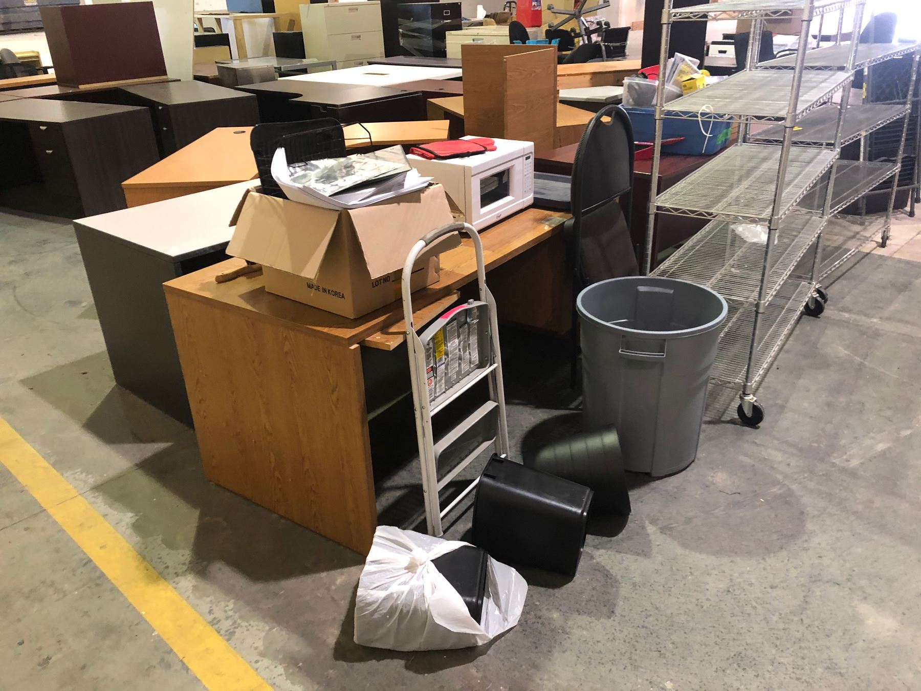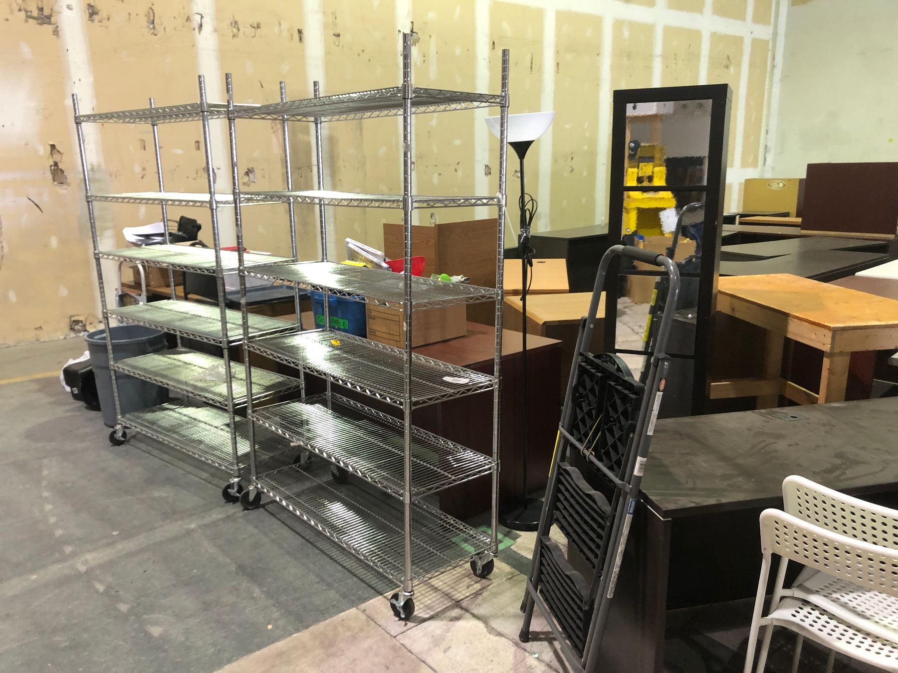 Large group of office furniture & 5 good working refrigerators (MUST TAKE ALL) - includes office chairs/ office desks/ office shelves/ floor lamps/ 2 rolling racks/ step ladders/ good working refrigerators etc.