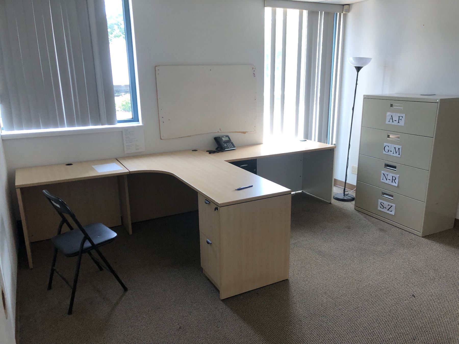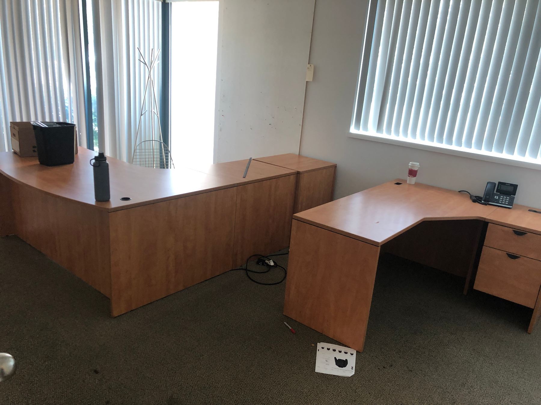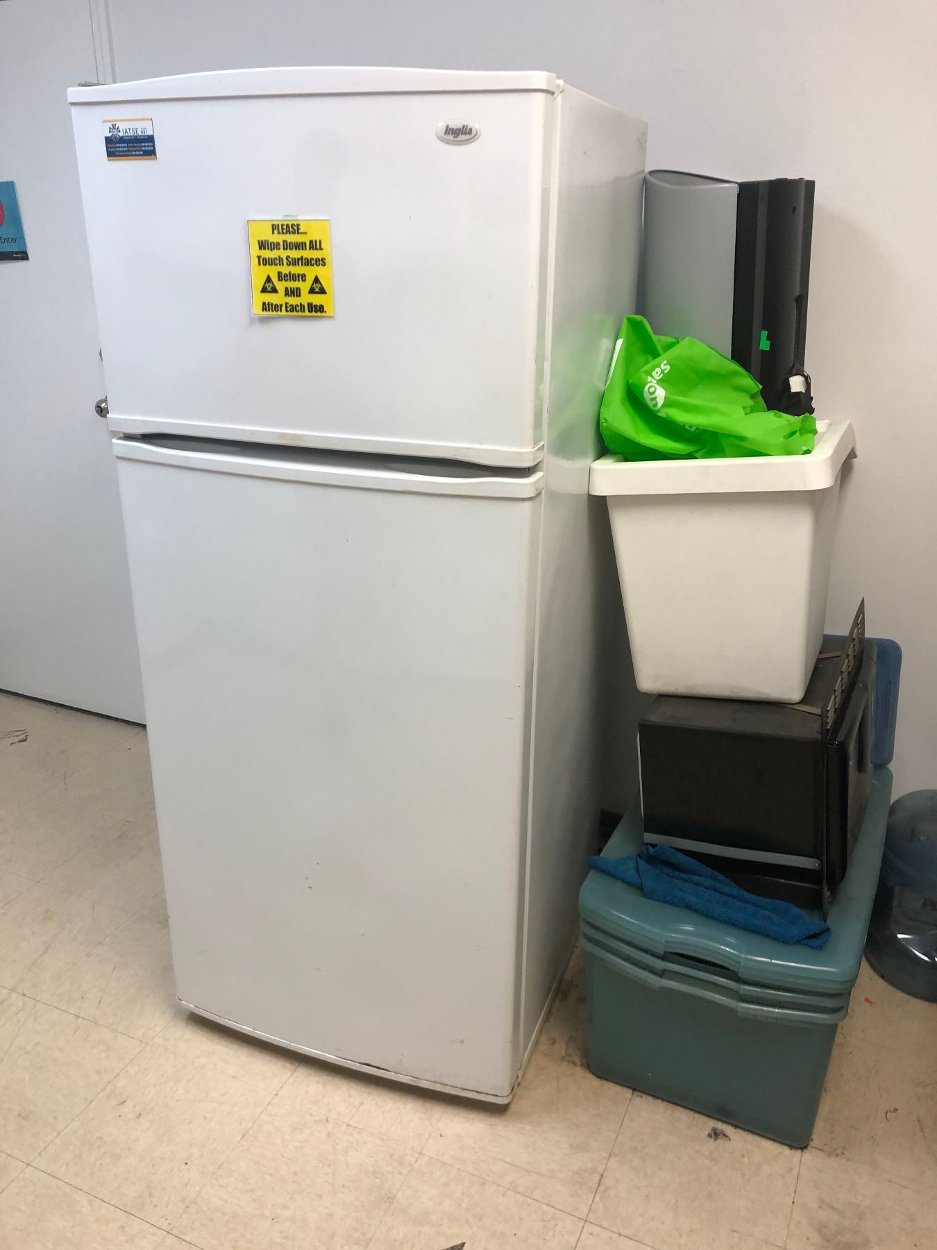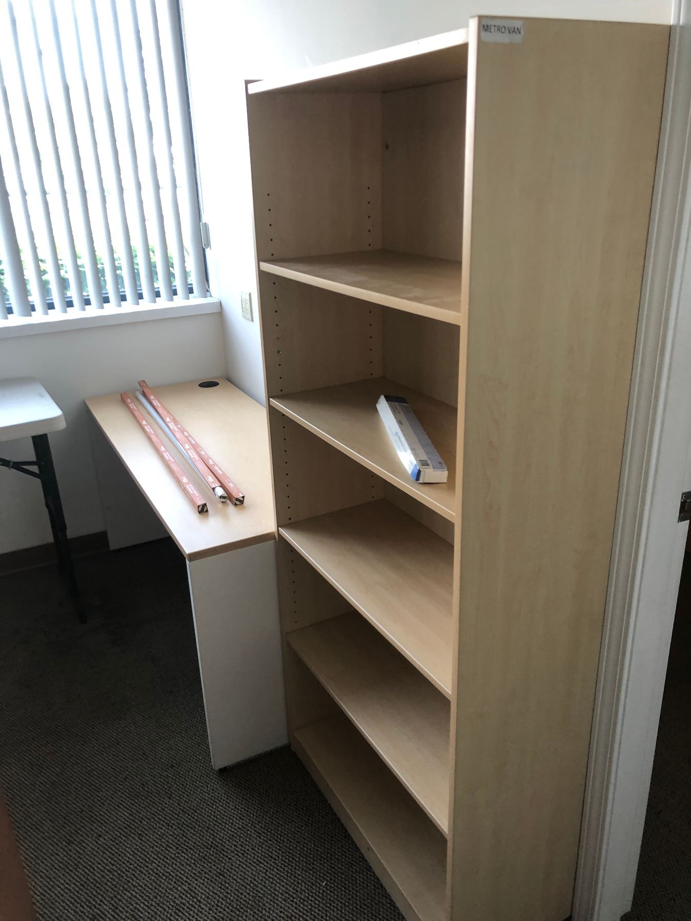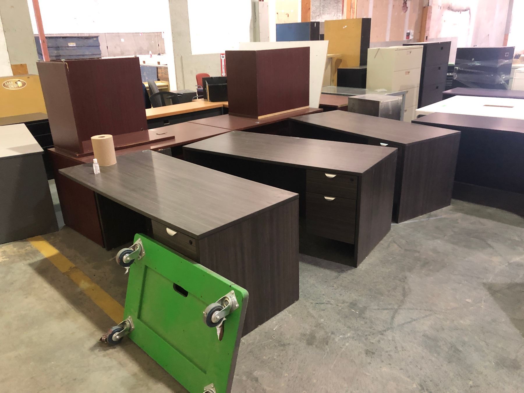Large group of office furniture & 5 good working refrigerators (MUST TAKE ALL) - includes office chairs/ office desks/ office shelves/ floor lamps/ 2 rolling racks/ step ladders/ good working refrigerators etc.