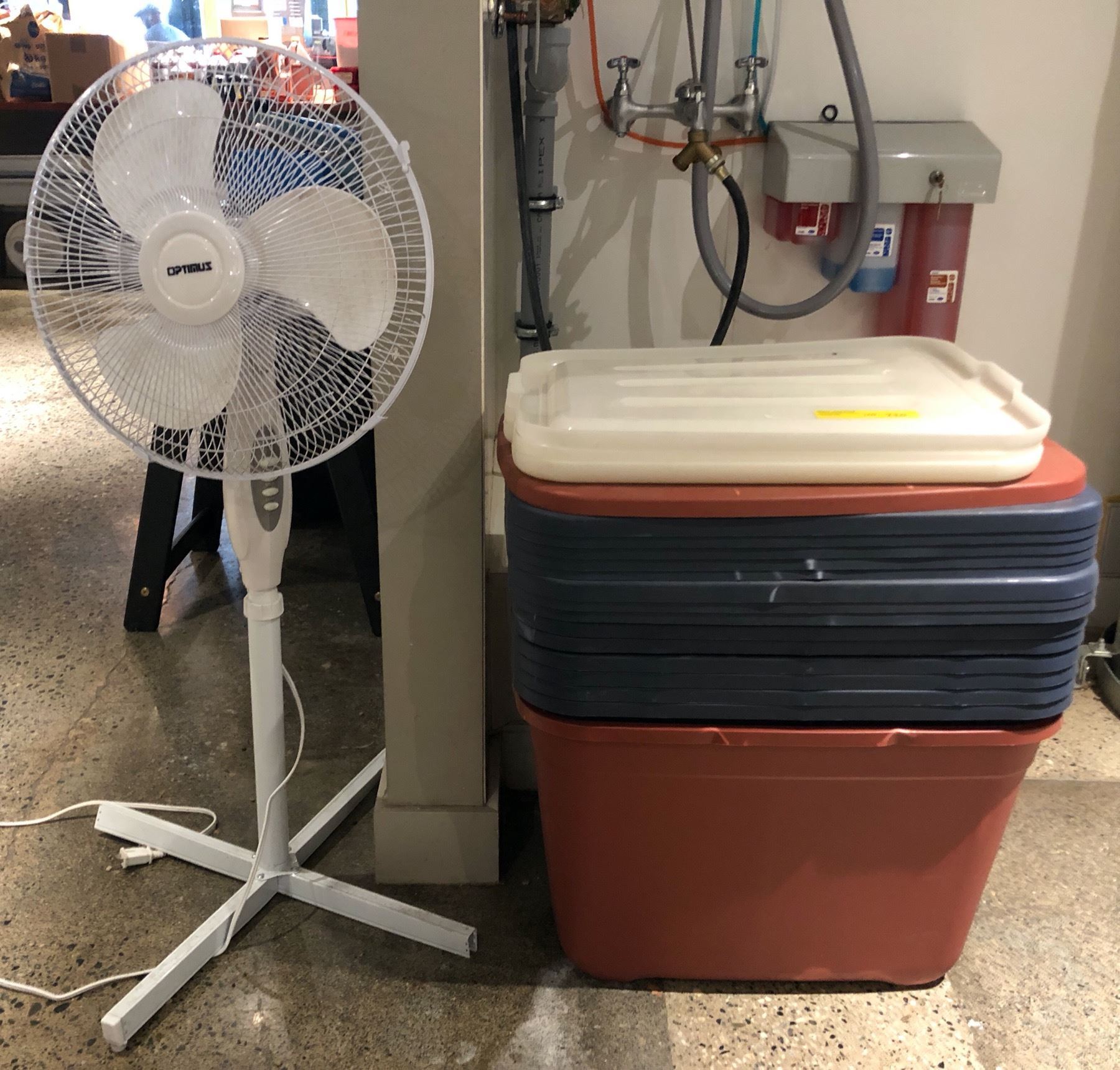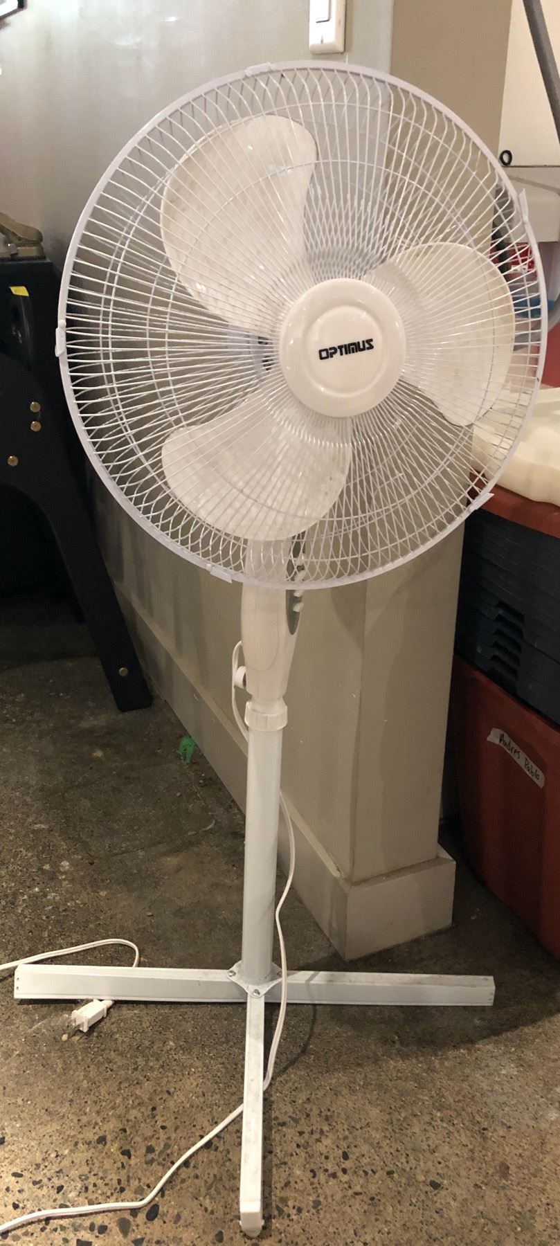 Large group of totes & Optiminus Stand fan - approx. 9 totes