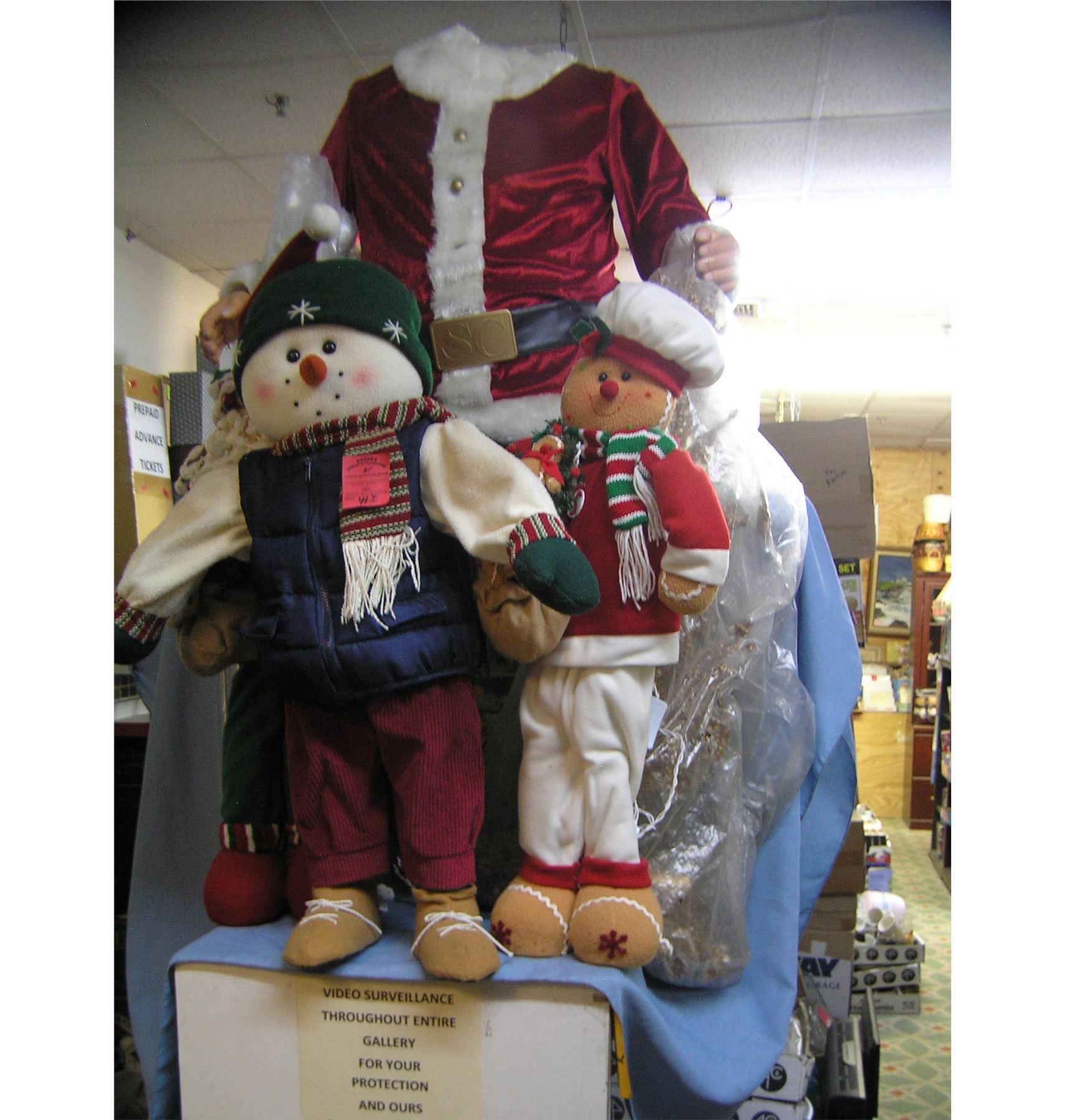 Large group of vintage Christmas collectibles includes a large mechanical Santa working but missing head , multiple large indoor and outdoor posable displays 2 are illuminated, gold beaded Christmas tree, vintage Christmas wrap and more est. value $100.00-$125.00