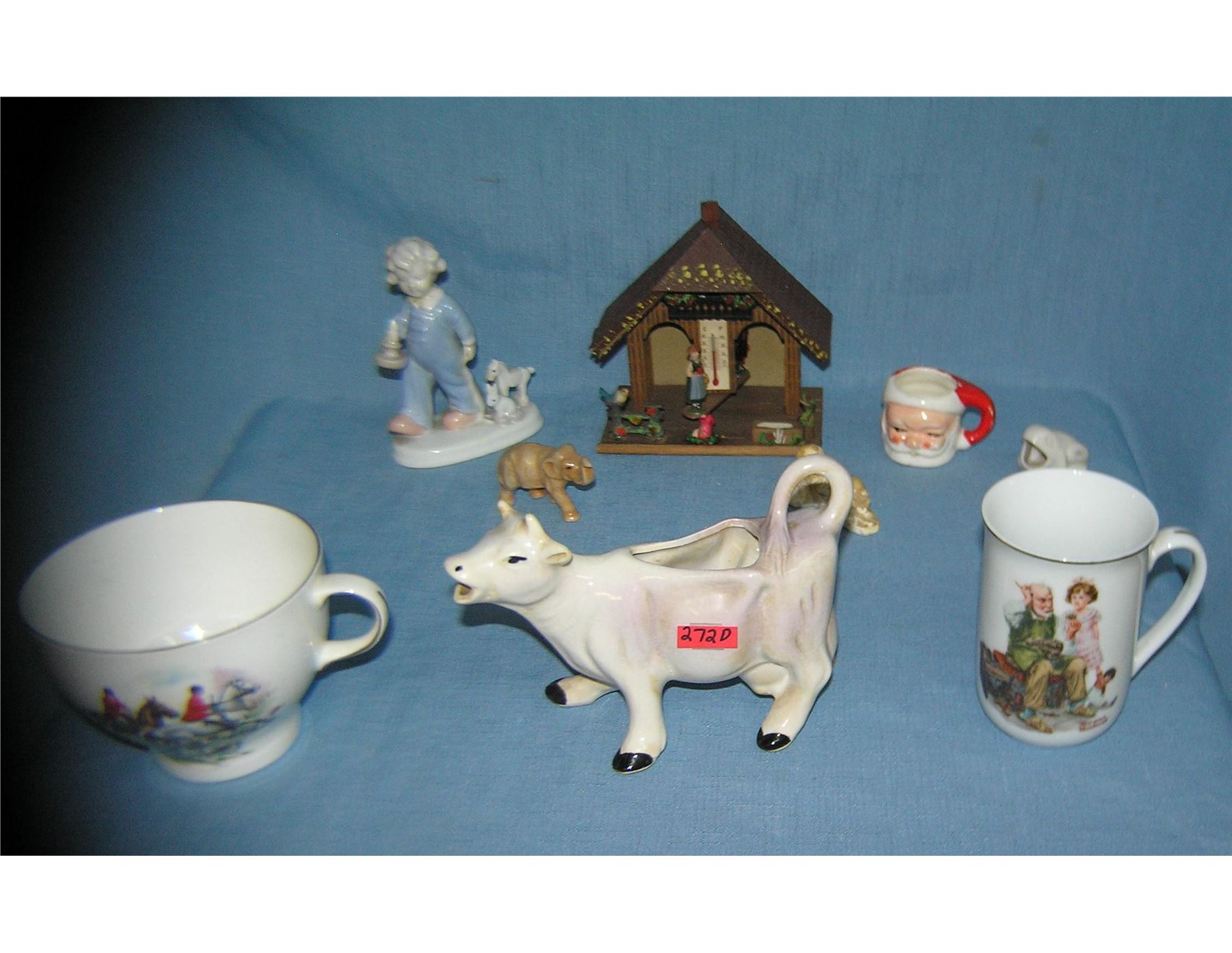 Large group of vintage figurines and collectibles includes an early cow creame, English bone china fox hunt cup, Norman Rockwell cup, German figural barometer and more est. value $100.00-$125.00