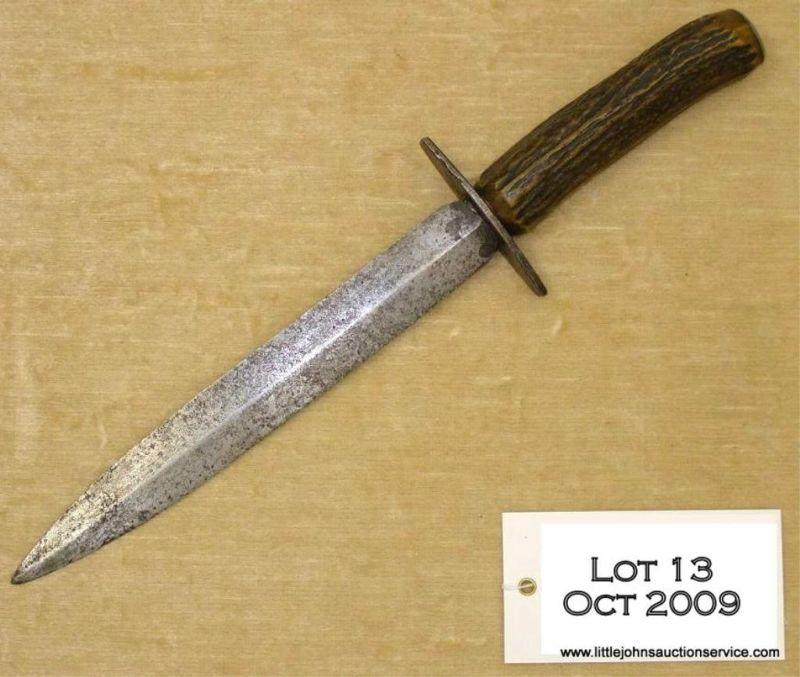 Large hand-made spear point bowie knife with stag grip, approx. 13-1/2” overall with a steel cross guard, circa mid-1800s. This knife is in overall good condition showing scattered pitting to the blade, good stag grip with circular flat metalpommel cap. Est.: $100-$300.