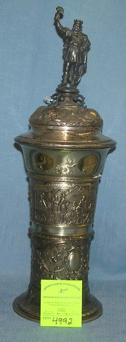 Large high quality silver plated beer chalice with brew meister finial Hallmarked on base W.M.F.B company circa early 1900?s $1,200.00-$1,500.00