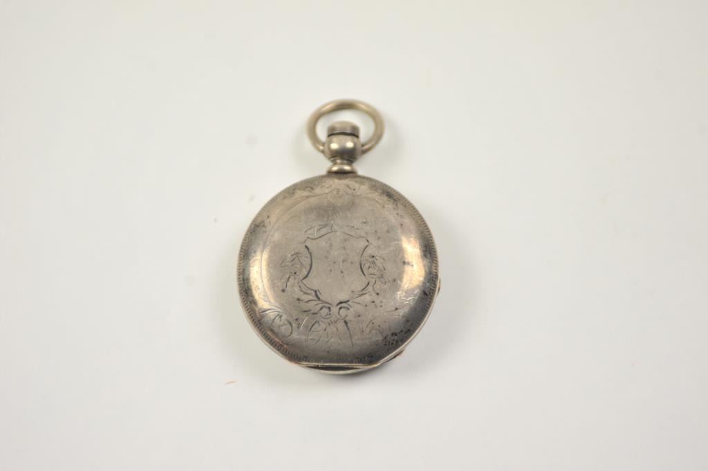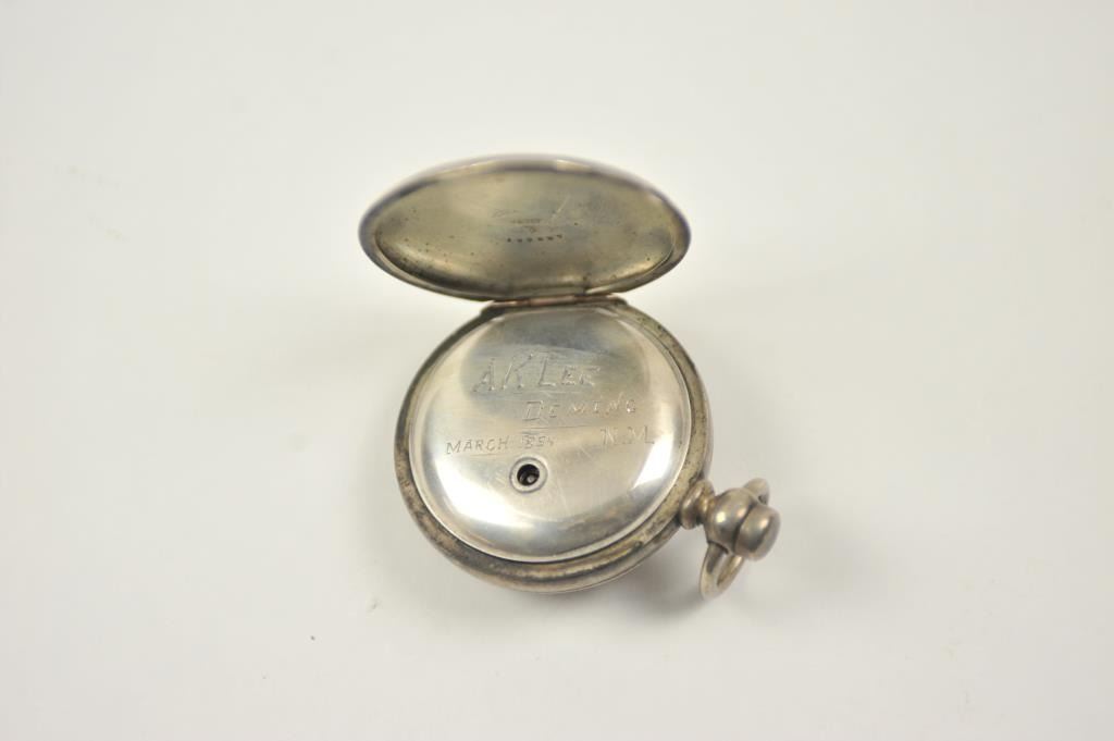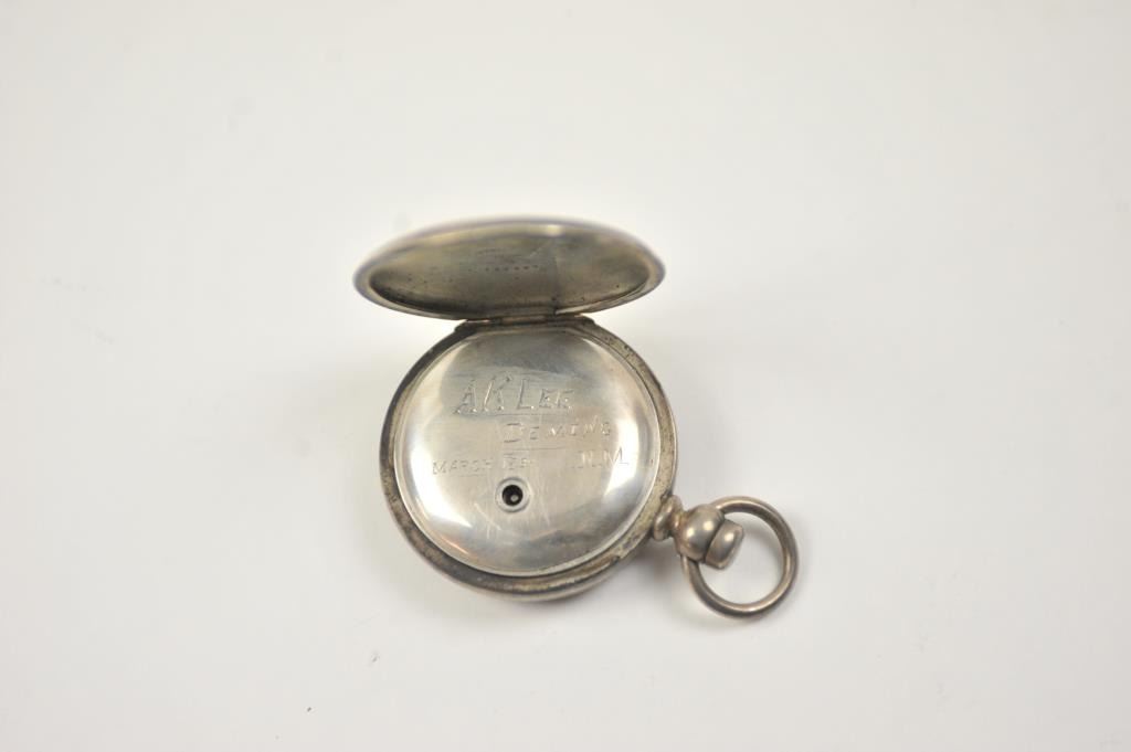 Large hunting case pocket watch with American Waltham movement, key wind, Serial #610903. The watch has a coin silver case by Keystone with an engraved portrait of a horse in bridle. The dust cover is engraved, A.K.LEE, DEMING, N.M. MARCH 1894 (Territorial era from frontier area of the West). Not working properly plus a few seconds and stops. Estate consigned. Est.: $175-$350.