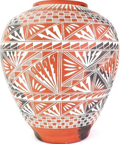 by artist team Michael and Robin Romero of the Acoma Sky City Pueblo New Mexico. Accomplihsed with hand painted pigments, hand etching, and hand coiled methods, signed bottm, 15" X 13". Est. 300-600