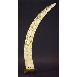 Large ivory tusk, heavily carved with figures climbing trees on a circular wooden base, 90cm high