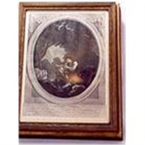 Large hindged jewelry box with gilt trim and lovely engraving of a child with sheep and a dog having a mirror and glass liner.