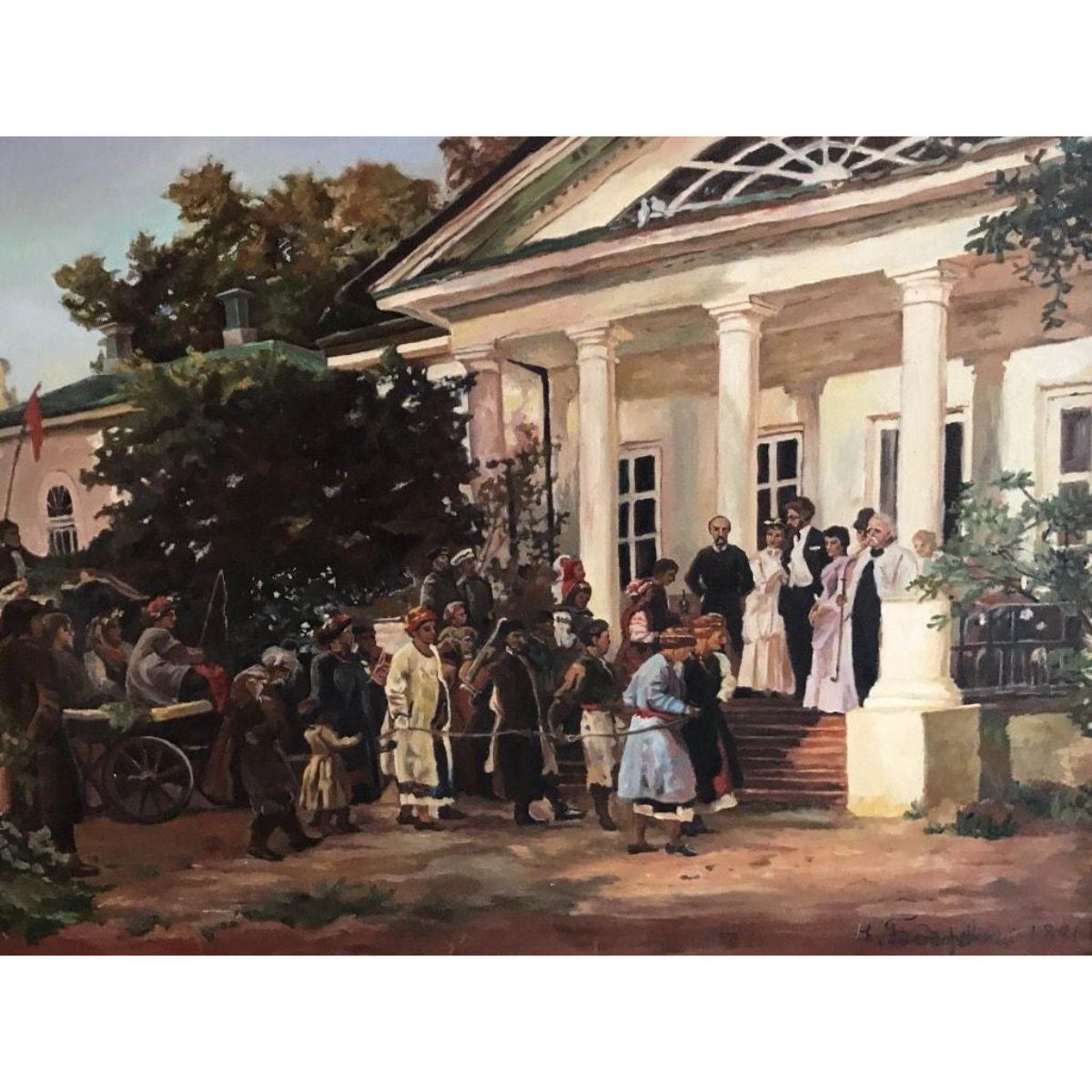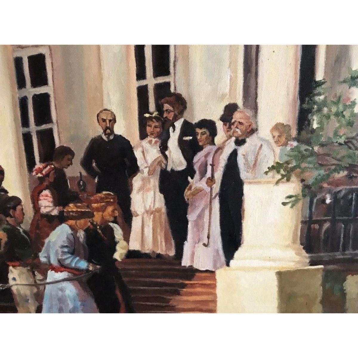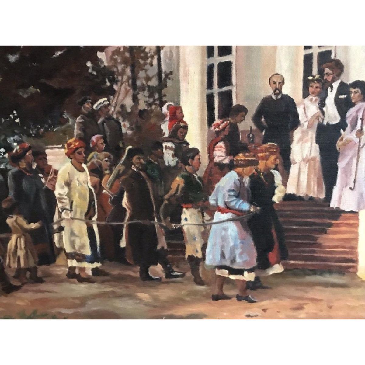 "The Wedding Party". Russian School, late 20th century oil painting on canvas, Framed 27" x 35". Fine quality depicting figures at a wedding gathering, most likely after an earlier work - as it is dated 1881 - though very obviously dates to the late 20th century. Signed to the lower right - either by its artist or the name of the painter of the original 1880's work. Condition report: overall sound condition with a few minor scuffs & marks to the surface. 9652-030118-EB-08965