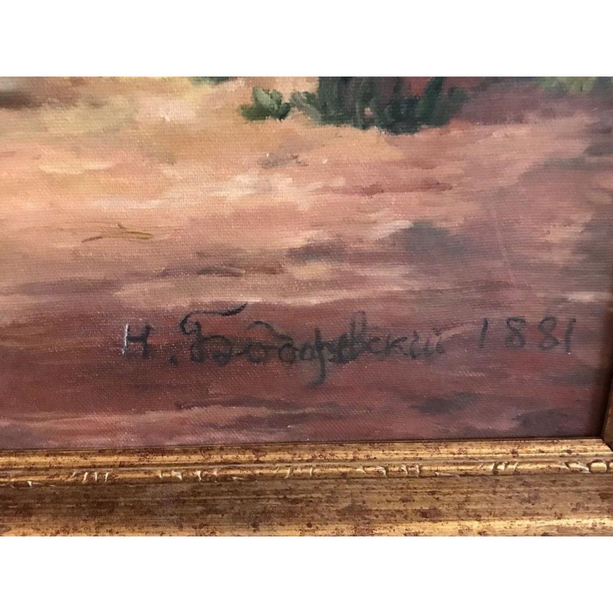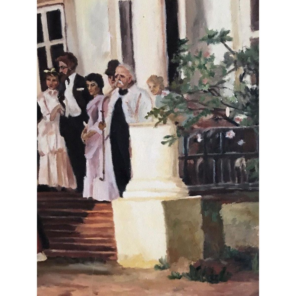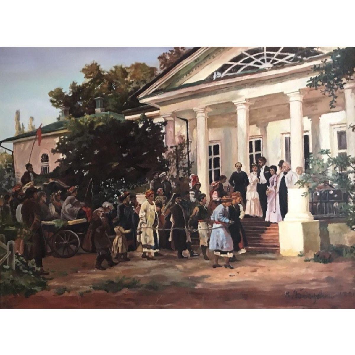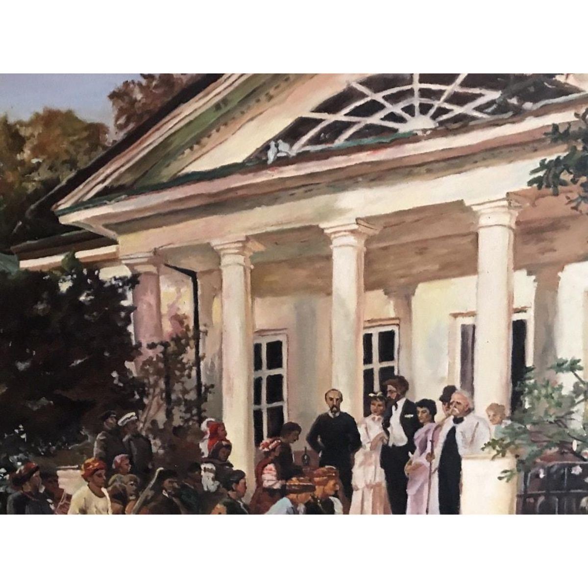 "The Wedding Party". Russian School, late 20th century oil painting on canvas, Framed 27" x 35". Fine quality depicting figures at a wedding gathering, most likely after an earlier work - as it is dated 1881 - though very obviously dates to the late 20th century. Signed to the lower right - either by its artist or the name of the painter of the original 1880's work. Condition report: overall sound condition with a few minor scuffs & marks to the surface. 9652-030118-EB-08965