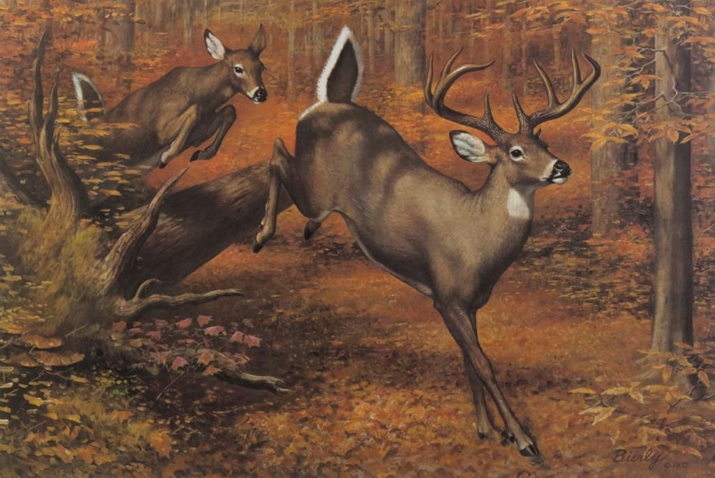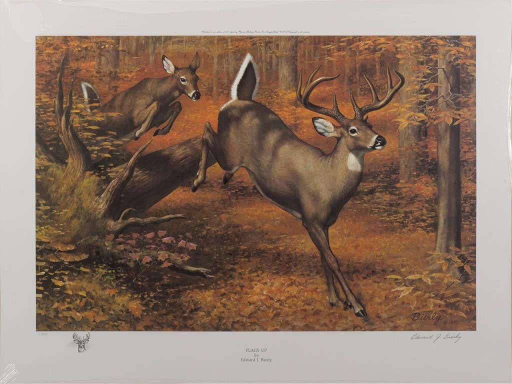 Large limited edition color print (1/800), hand signed by Edward J. Bierly entitiled “Flags Up”, 1977, approx. 22” x 30” with hand sketched deer’s head in lower left hand corner; ready for framing and display in any sportsman’s office or gameroom. Est.: $75-$100.
