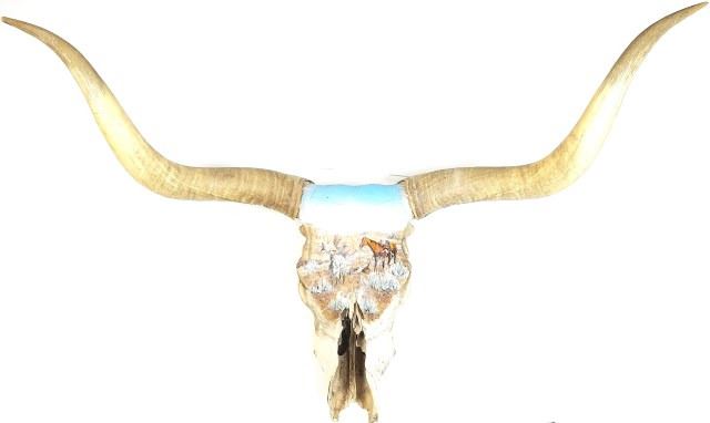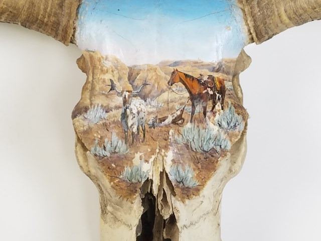 Waynes classic movie "Red River" the paperwork and provenance now missing. Skull shows terrific painted cowboy to the front, unsigned, hornw with great twist and 48" tip to tip. Est. 400-800