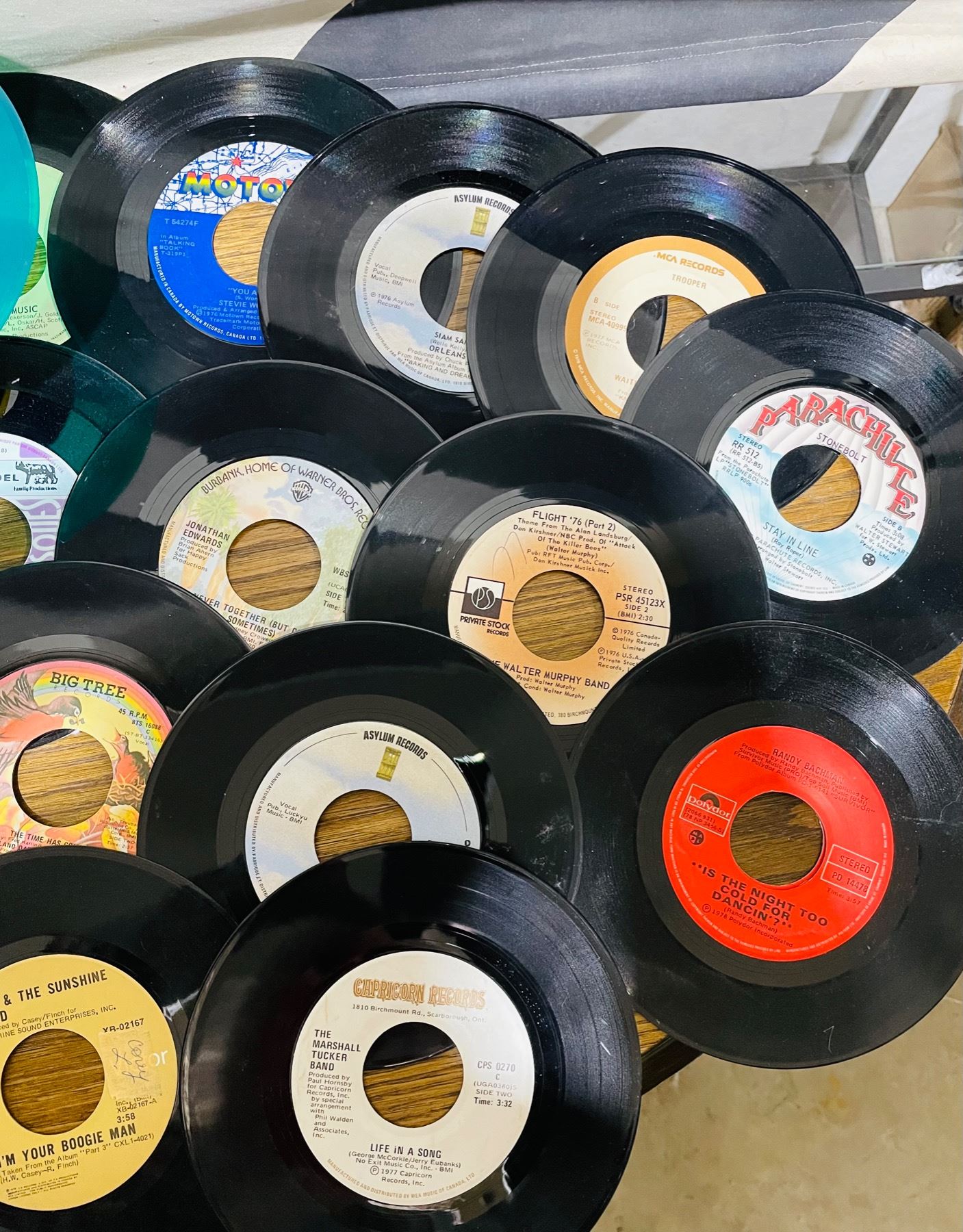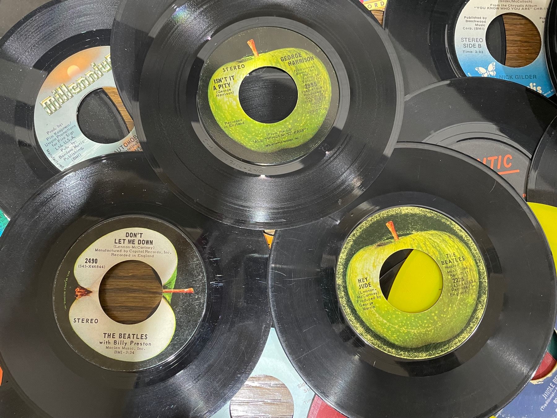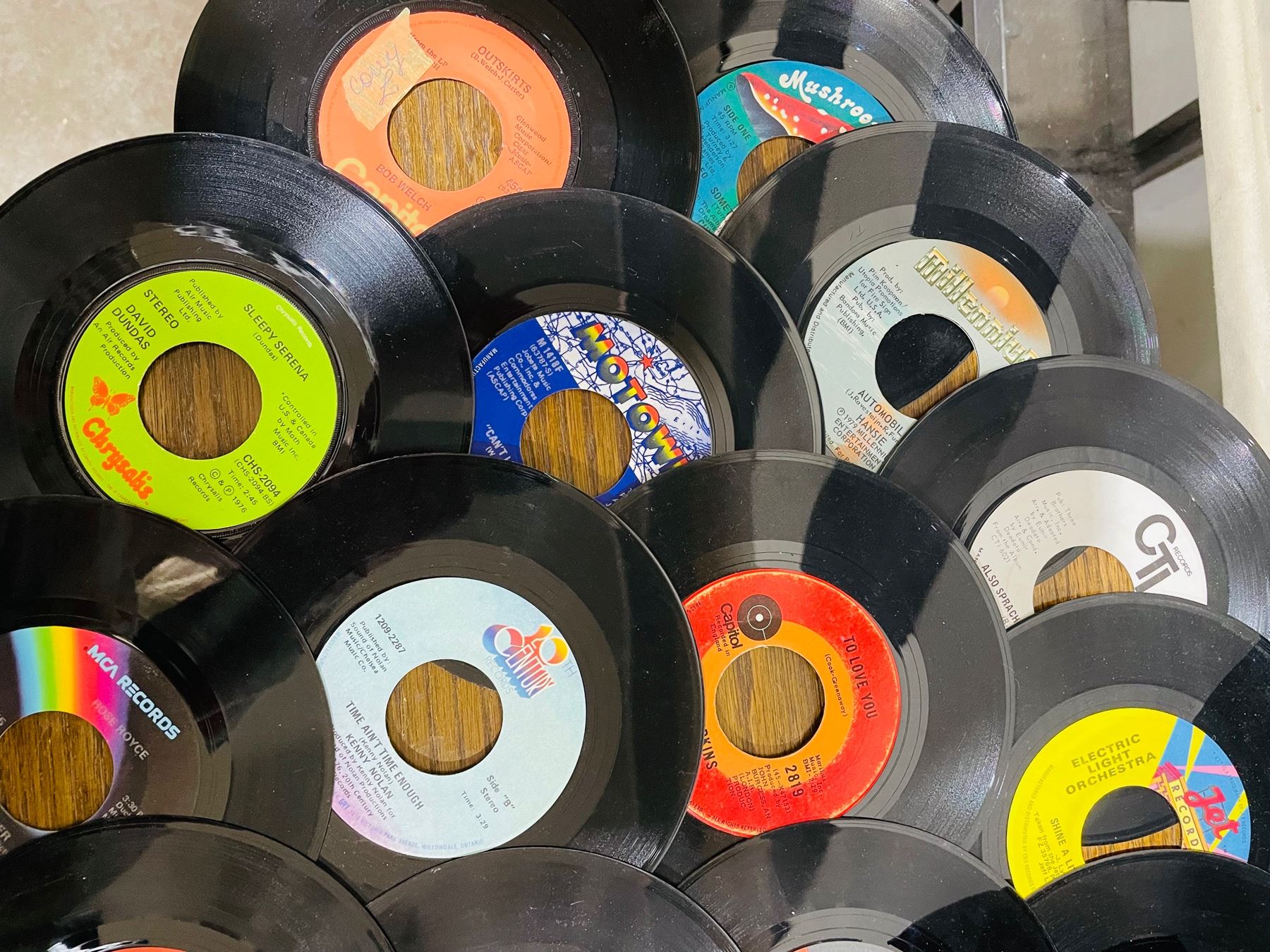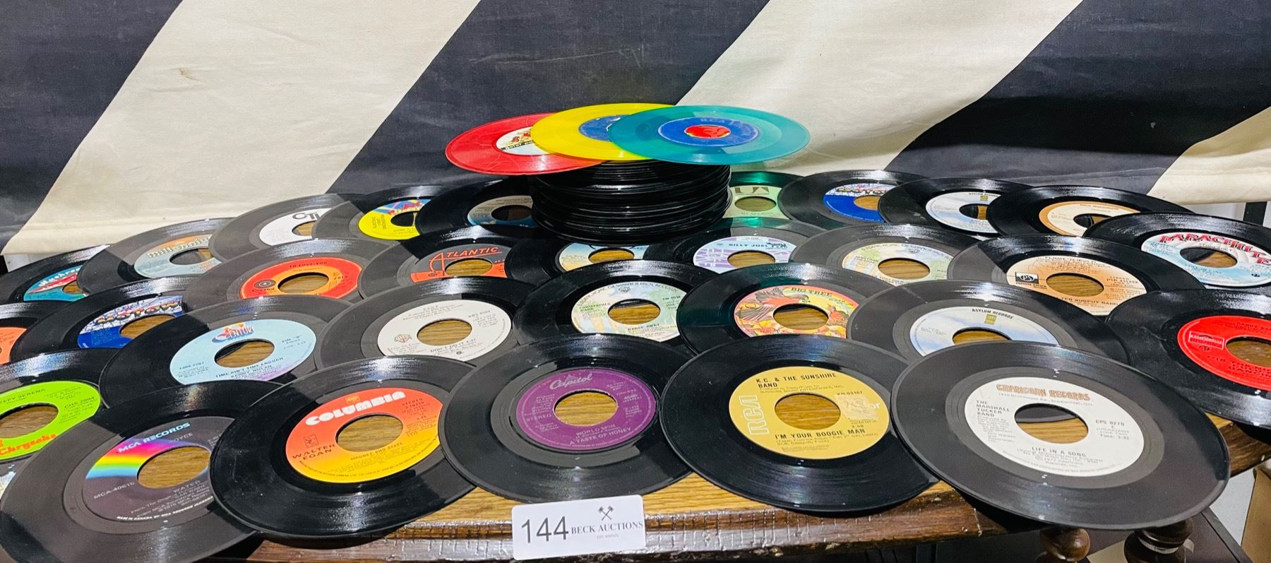 Approximately 50 - 60 vintage records 45 RPM. they do not have sleeves.