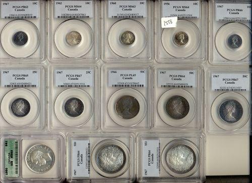 Large lot of 13 certified coins. Including five PCGS 10 cents, 1956 MS64, 1960 MS63, 1962 MS64 and two 1967 PR62 and PR66. Two PCGS 25 cents 1967, one is PR65 and the other is PR67. Three PCGS 50 cents; a 1966 PL65 and two PCGS 1967, one is PR64 and th
