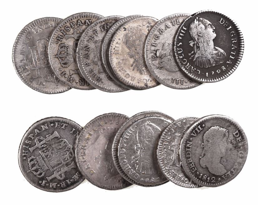 Large lot of 14 Lima, Peru, bust 1R, Charles III through Ferdinand VII, dates as follows: 1773JM, 1775MJ, 1777MJ, 1778MJ, 1779MJ, 1781MI, 1785MI, 1798IJ, 1802IJ, 1806JP, 1808JP, 1812JP, 1813JP and 1821JP. 44.18 grams total. About Fine to AXF, no holes or major damage, only a few with toning.