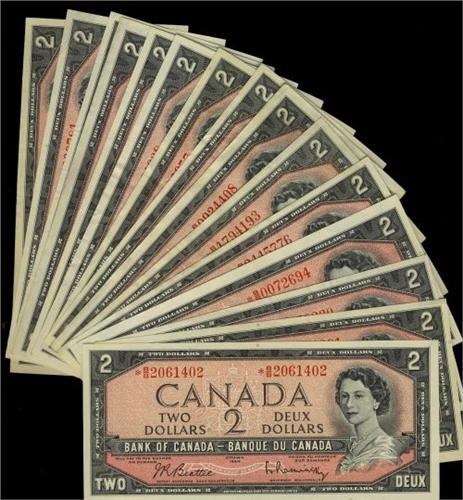 Large lot of 15 replacement 1954 $2 notes. Bc-38bA, alll *B/B's and grades vary from EF to Choice AU