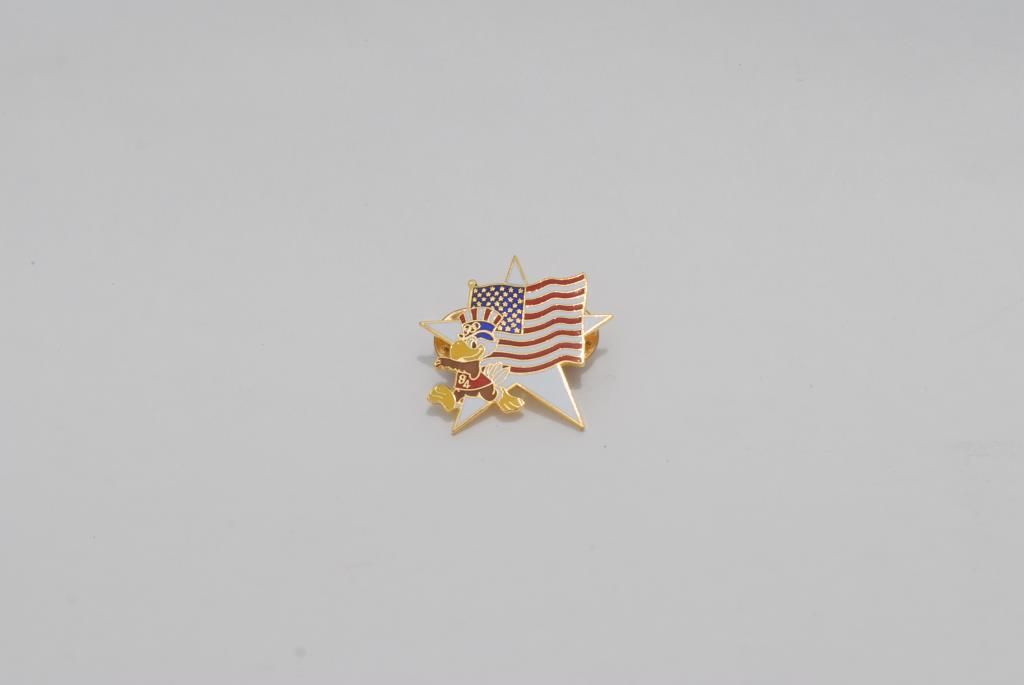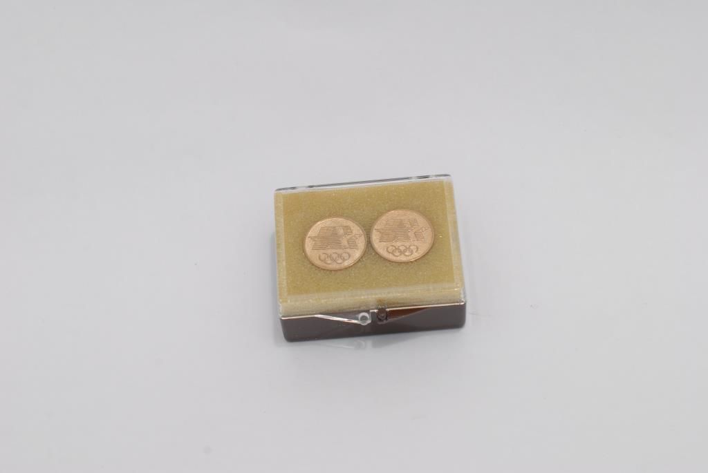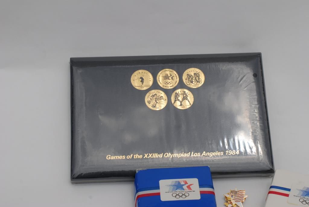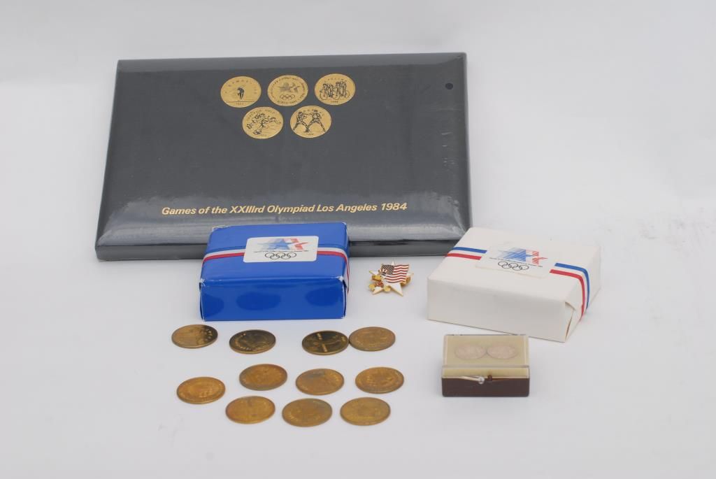 Large lot of 1984 Los Angeles Olympic Commemorative pins and coins in cardboard box indicating a Corporate gift from World Color Press to Mr. & Mrs. Robert E. Petersen; numerous different pins including shootingevent pins, etc. From the estate of Robert E. Petersen. Est.: $200-$400.