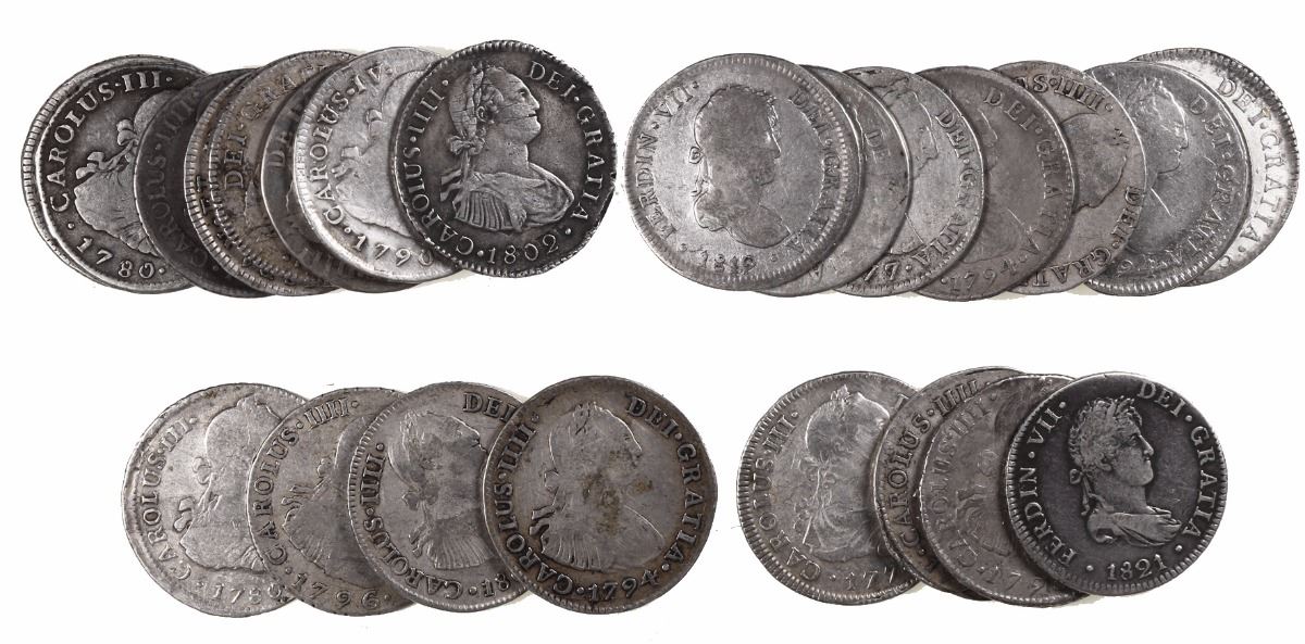 Large lot of 24 Lima, Peru, bust 2 reales, Charles III through Ferdinand VII, dates as follows: 1774MJ, 1777MJ, 1780MI (2), 1786MI, 1789IJ, 1790IJ, 1791IJ, 1793IJ (2), 1794IJ (3), 1795IJ, 1796IJ, 1797IJ, 1798IJ, 1802IJ (3), 1803IJ, 1805JP, 1819JP and 1821JP. 156.08 grams total. About Fine to VF+, mostly toned but some cleaned, no major damage, a few with clashed dies.