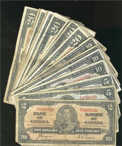 Large lot of 24 notes. Incluing; $2 1937 (1), $5 1937 (2), $10 1937 (5), $20 1937 (16). Grades vary from Good to Fine. Notes have some tears and or writing. Should be viewed! Sold as is, no return.