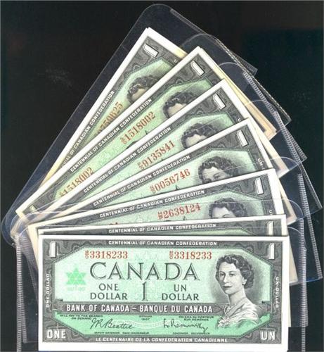 Large lot of 40 "Centennial banknotes". Includes BC-45b 1967 $1 Prefix S/O, P/O, O/O, M/O, I/P, H/P. Grdes vary from AU to Unc.