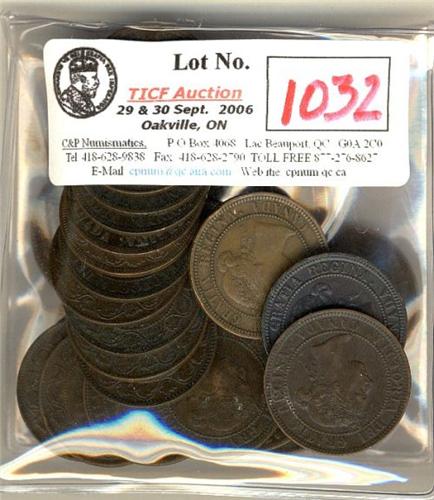 Large lot of 42 "Victorian" large cents dated from 1876H to 1901. Grades vary from F-15 to VF-30.