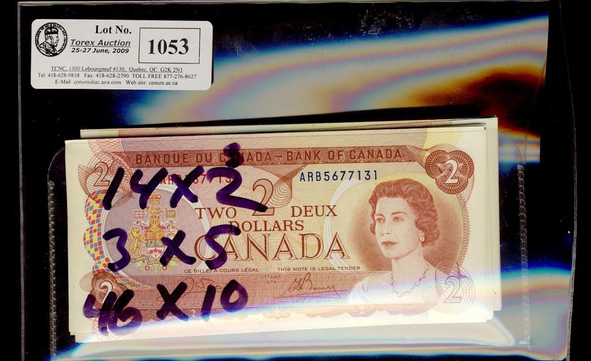 Large lot of 63 Multi-coloured notes, includes 1974 $2 (14), 1972 $5 (3), 1971 $10 (46). Different signatures and prefixes. Grades vary from EF to Gem Unc. Average Uncirculated. Should be viewed! Sold as is, no return.