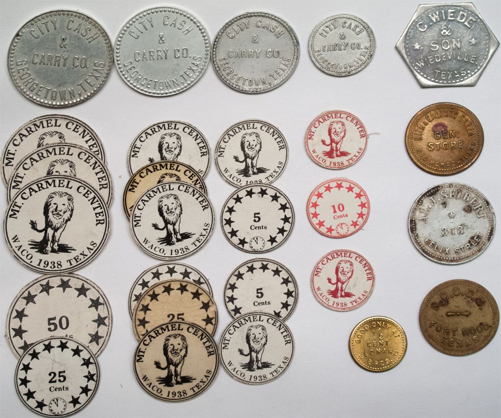 1) Al J. Seibert of Fort Worth GF 5c IT. 2) C. Wiede & Son of Wiedeville GF 50c IT. Interesting piece Wiede of Wiedeville! 3) Same as two. 4) Rio & Calixto Graza General Store of Rio Hondo GF 5c IT. 5) Very small Leonard Bros 1/2c. 6) N.C.O.O.M. Fort Hood GF 5c IT. 7) Four different City Cash and Carry from Georgetown. 8) Four sets of Mt. Carmel Center of Waco, Texas. Five different denominations. (One set is not complete.) 1938. New Mount Carmel Center was the name of the Branch Davidian home outside of Waco, Texas, United States, led by Benjamin Roden and later David Koresh. It was here that the Waco siege of 1993 occurred, in which four ATF agents and 83 Branch Davidians were killed.