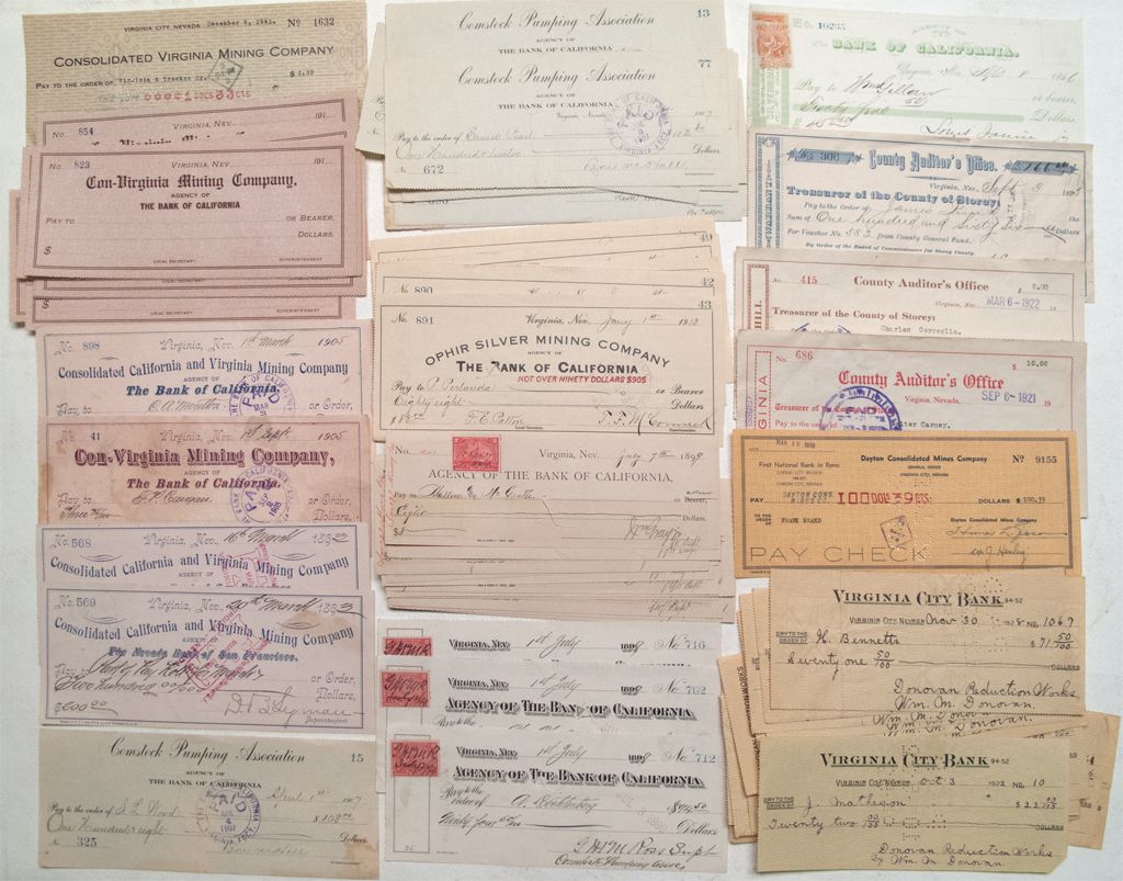 84 pieces. Includes Bank of California, Gould & Curry with a Nevada 2c orange revenue stamp, 16 Agency of the Bank of California checks with a red 2c document stamp, Ophir Silver Mining Company checks, Comstock Pumping Association checks, Consolidated Virginia Mining Company checks, and Virginia City Bank checks.