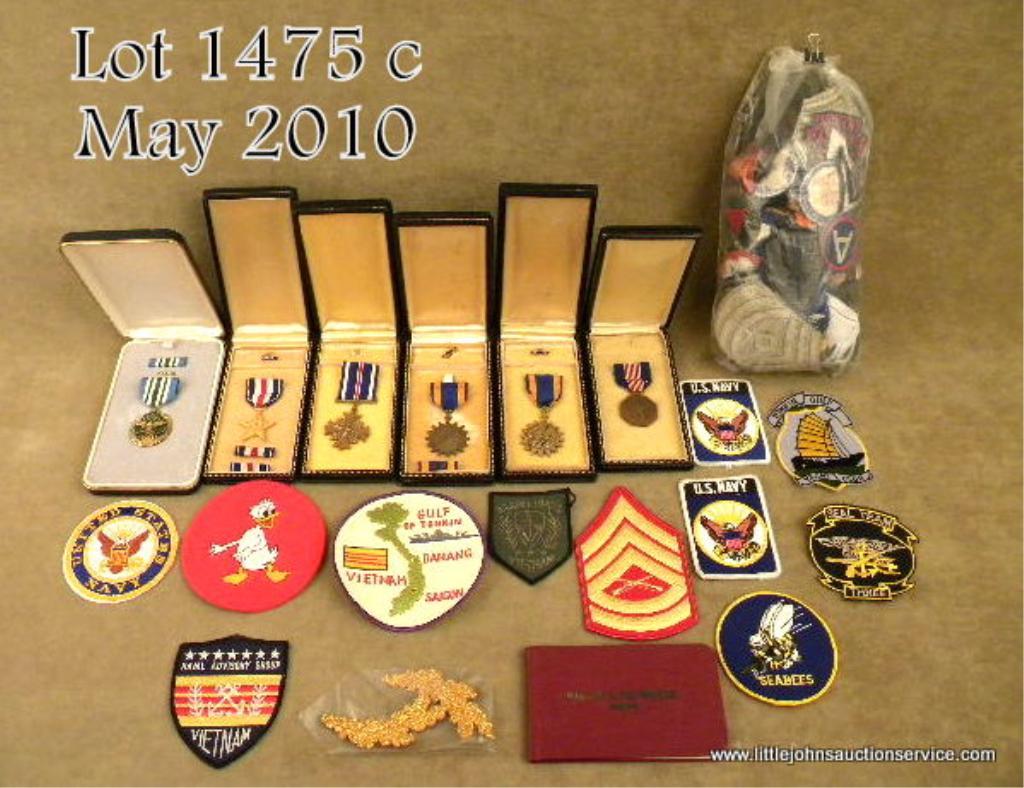 : Large lot of WWI, WWII, and Vietnam war patches, medals, and other miscellaneous memorabilia including aircraft recognition playing cards, etc. Est: $200 - $400