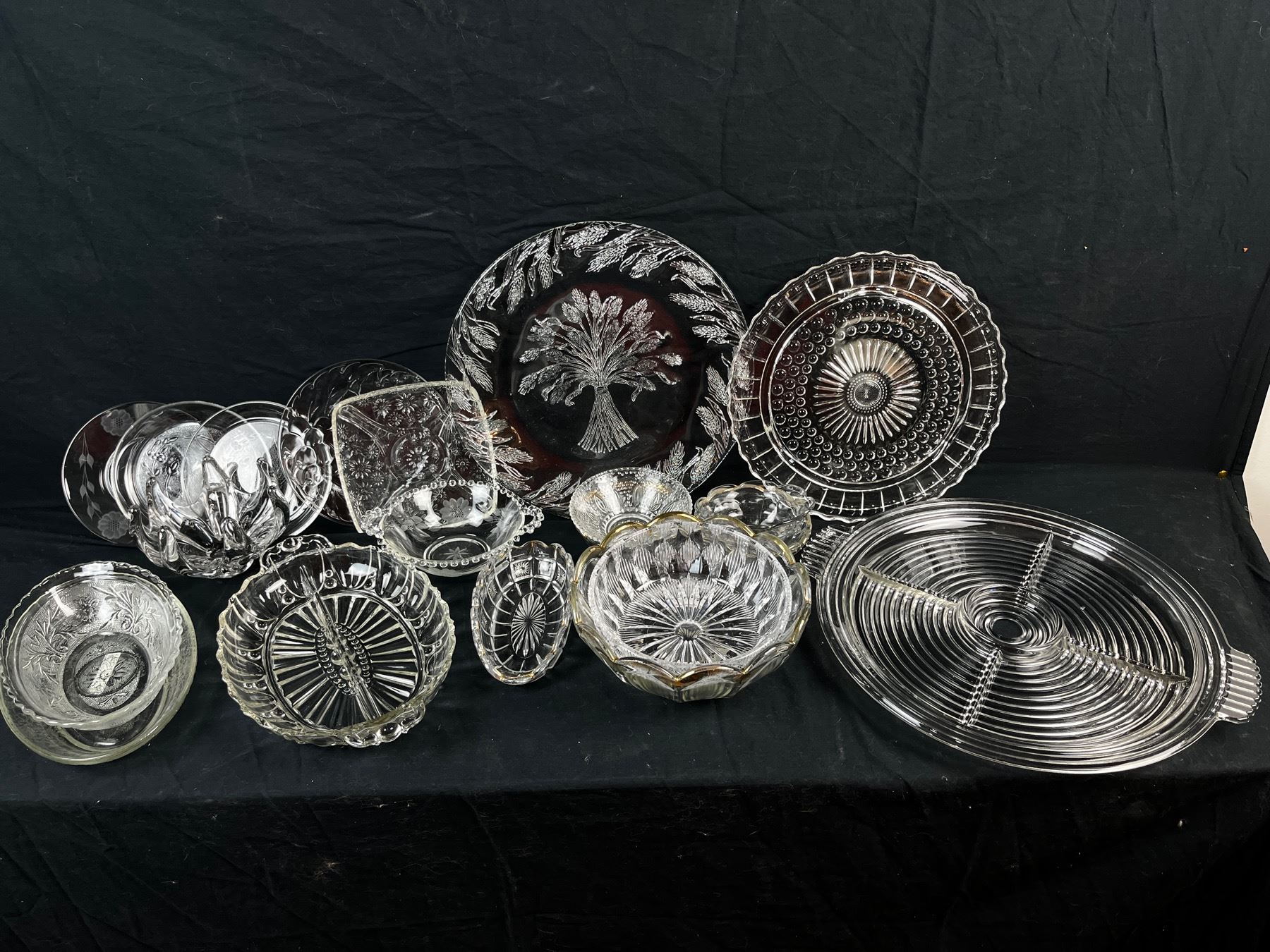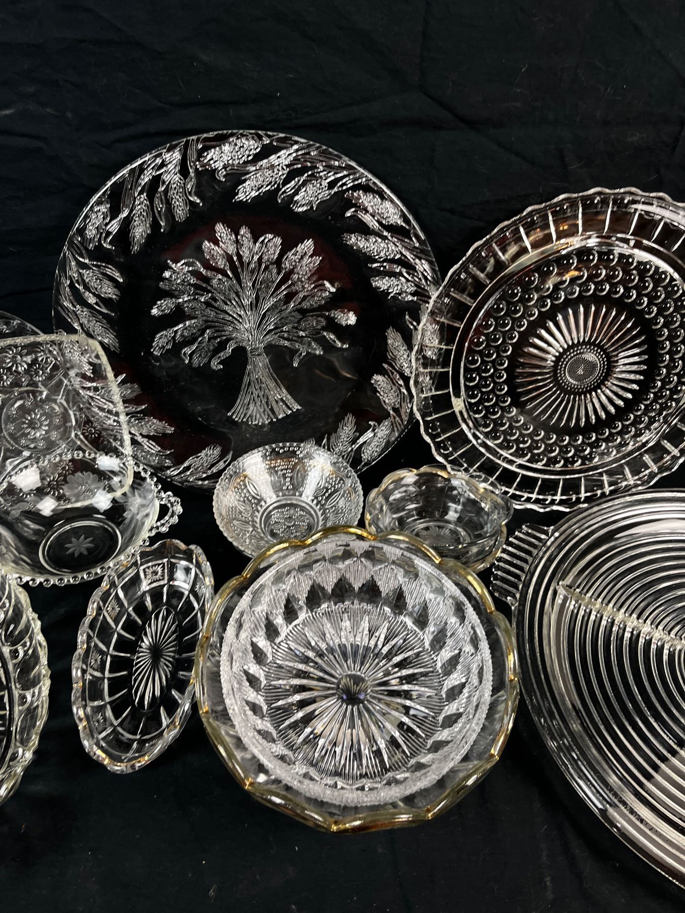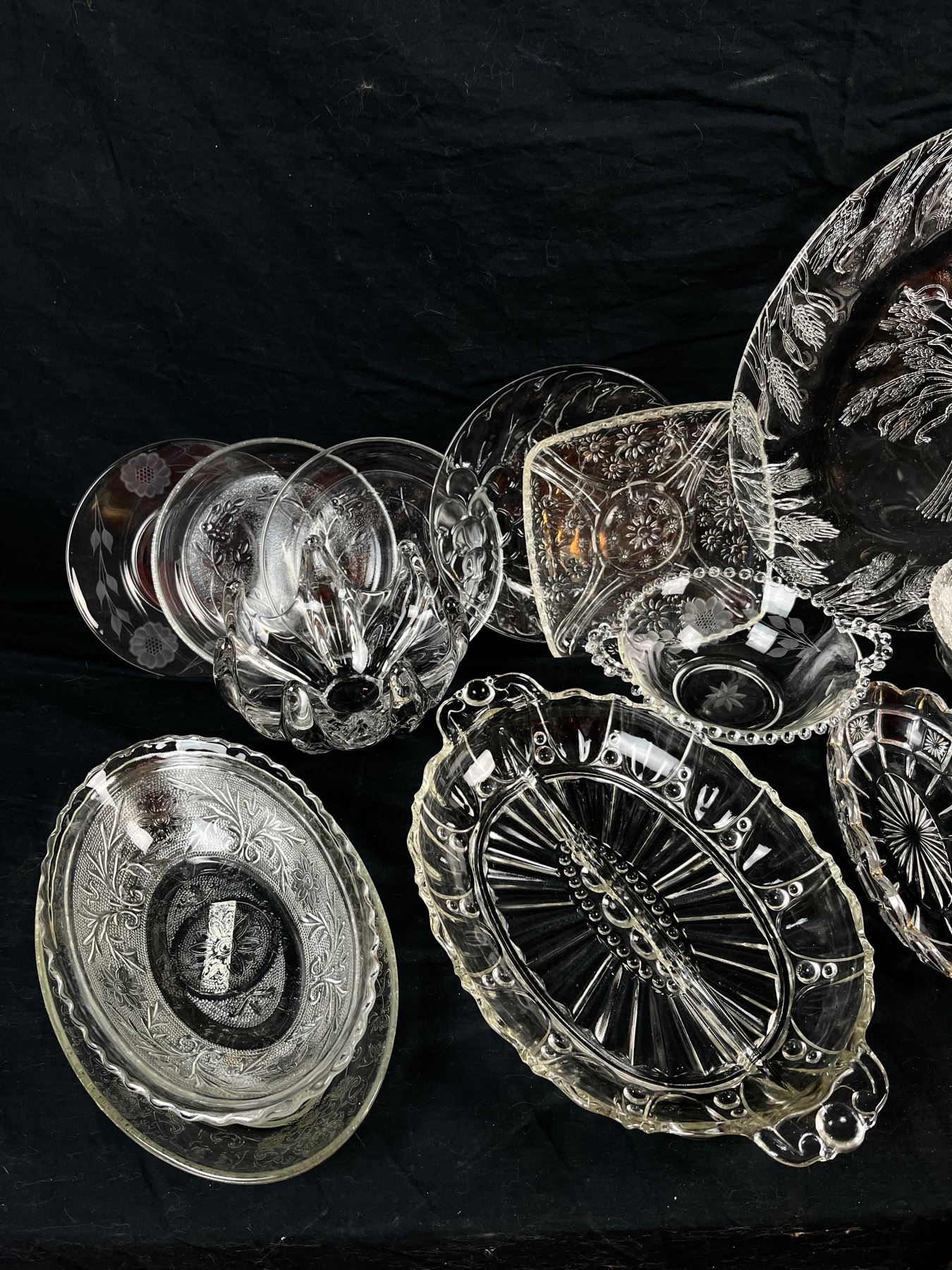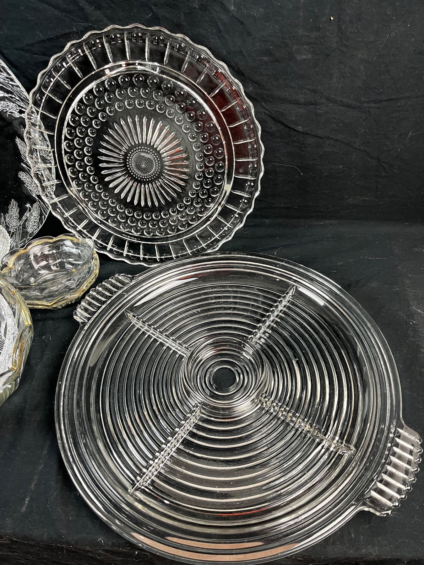 Bowls serving trays and miscellanious decorative pressed glassware.