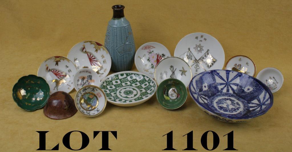 Large lot of dozens of Japanese saki cups, small plates, containers, etc., mostly decorated and beautifully colored, all in very good condition at time of description. Est.: $150-$300.