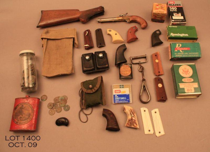 Large lot of misc. factory ammo boxes, full and partial, several collectible powder tins, several pair of Ruger and misc. grips for revolvers and semi-auto pistols, military compass, French Indo-Chinese jar of coins, reproduction singleshot percussion pistol, etc. A great gun show lot. Est.: $150-$300.