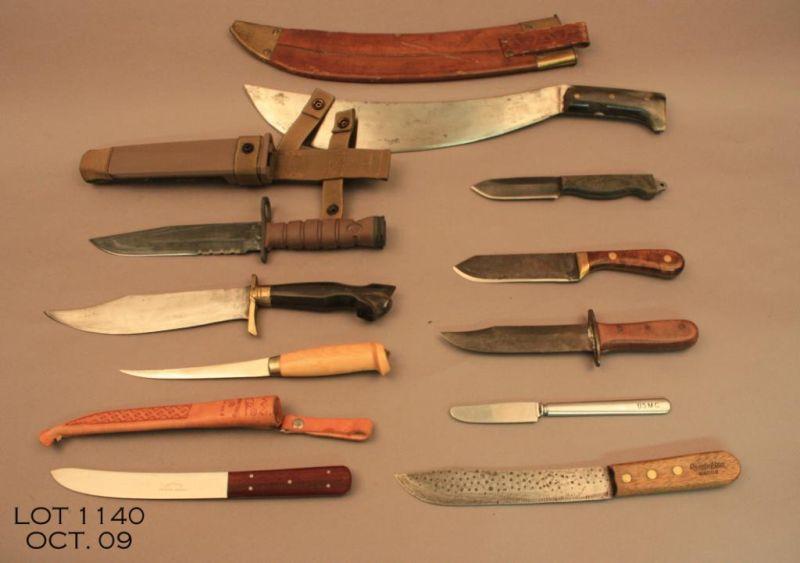 Large lot of misc. knives and edged weapons including a Collins No. 1005 machete and leather scabbard; a combat USMC bayonet knife and brown hard rubber sheath; three unmarked medium sized knives without sheaths; a Marttiini fishing knifeand leather scabbard; a Remington K4808 knife; a Venture knife, a mid-eastern clip point knife and a USMC-marked mess knife. Est.: $150-$300.