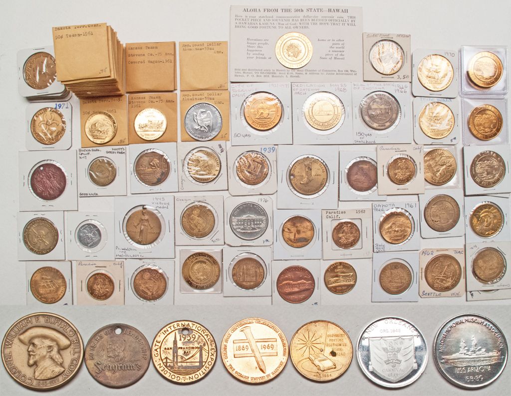 Lot of seventy-six. 1-21) Dakota Territorial centennial, uncirculated. 22-28) Centennial Blossom Dollar, British Columbia. 29-35) Oregon 100th Anniversary celebration. 36-42) 1959 Alaska GF one dollar IT. Six are uncirculated. 43-46) Stevens County, Kansas Covered Wagon, 1961, 75th Anniversary. 47) 1961 Kansas Centennial Coin, Gove County. 48-51) 1939 Golden Gate International Exposition, bronze. 52-55) 1970 eighth annual sea festival, Vancouver, uncirculated. 56-57) Hawaii statehood souvenir pieces. One has been blessed by a Hawaiian Kahuna. 58-59) 1962 Paradise, California. 60-61) Vote Republican uncirculated rounds. 62) 1962 Alaska GF $1.00 IT, unc. 63) Unc 1962 America's Spage Age World's Fair. 64) Undated White House 65) 1964 General Motors. 66) 1969 Golden Spike Centennial, excellent condition. 67) USS Arizona, Arizona Memorial Museum Association. 68) 1967 Mardi Gras, Lyons Carnival Club. 69) 1971 Cody Stampede 70) 911 Enduring Freedom 71) 1937 San Francisco Mint. 72) 1938 Columbia GF $1.00 73) Knott's Berry Farm, K-17. 74) 1939 DECLARATION OF ECONOMIC INDEPENDENCE HONOR AWARD MEDAL 75) Treasure Island, Las Vegas, One dollar. 76) 1957 SEAGRAMS! 77) A DEDICATION OF THE GATEWAY ARCH COIN, MAY 25,1968. MADE OF ALUMINUM WITH A BRASSY FINISH/COATING. THESE COINS WERE GIVEN TO THOSE WHO ATTENDED THE DEDICATION CEREMONY. 78) Sesquicentennial of 1966 seal of the state of Indiana .79) 1971 City of Torrance 50 years. 80) 1945 Victory Medal. 81) 1963 Tony Lama 50th Anniversary.City: County: State: Date: