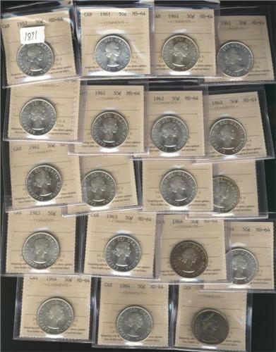 Large lot of nineteen ICCS MS64 graded coins. Includes a 1957, 1961 (4), 1962 (6), 1963 (3), 1964 (4) and a 1967. Most of the coins are brilliant.